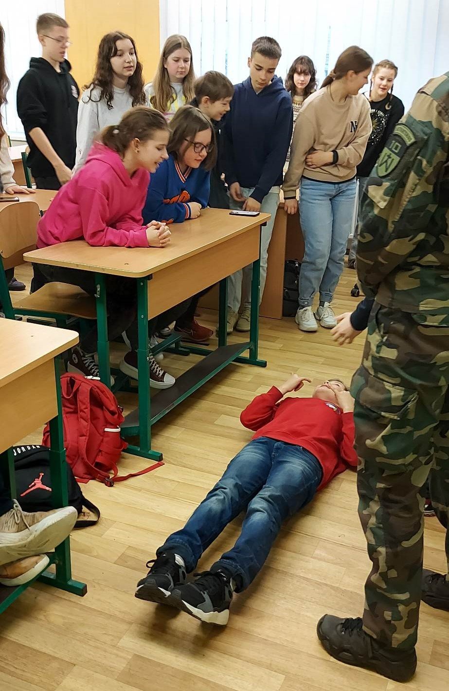 Paskutinę kovo mėnesio dieną, šeštokų istorijos pamokoje apsilankė Lietuvos Šaulių sąjungos atstovė Karolina Savickytė, kuri pristatė šios visuomeninės organizacijos tikslus ir siekius Lietuvoje, parodė vaizdo įrašą apie šią savanorišką organizaciją ir paaiškino, kodėl ir kaip visi piliečiai, dideli ir maži, vieni kitiems turėtų padėti. Mokiniai su šaule klasėje bandė teorines žinias pritaikyti praktikoje – suvaidino situaciją, kaip reikėtų elgtis, gatvėje radus asmenį, praradusį sąmonę, sužinojo kaip naudotis medicininiu defibriliatoriumi. Taip pat susitikimo metu apdovanotas Dominykas Rudis, kuris Nepriklausomybės dienai skirtoje šaulių viktorinoje užėmė 4 vietą. Jis laimėjo kelialapį į vienos dienos šaulišką, pilietiškumu ir išgyvenimo elementais kvepiančią stovyklą!