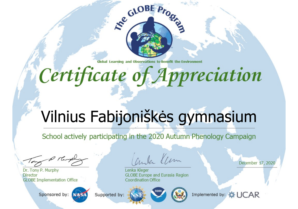Džiaugiamės, kad mūsų gimnazijos „GLOBE tyrimai“ būrelio (vadovaujamo mokytojos R. Alkimavičienės) narių 2020 m. rudenį atlikti fenologiniai medžių (Raudonojo ąžuolo, Karpotojo beržo, Mažalapės liepos, Kaukažinės slyvos, Uosialapio klevo) stebėjimai buvo įvertinti tarptautiniu sertifikatu.