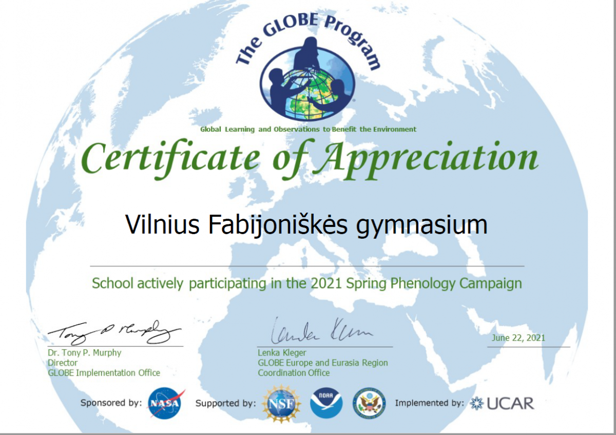 Džiaugiamės, kad mūsų gimnazijos „GLOBE tyrimai“ būrelio narių 2021 m. pavasarį atlikti fenologiniai medžių (Raudonojo ąžuolo, Karpotojo beržo, Mažalapės liepos, Kaukazinės slyvos, Uosialapio klevo) stebėjimai buvo įvertinti tarptautiniu sertifikatu.