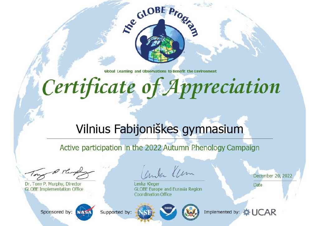 „Globe tyrimai“ būrelis, skirtas 5-8 klasių moksleiviams, 2022 m. rudenį (nuo rugsėjo iki gruodžio) atliko fenologinius medžių stebėjimus. Vyko Raudonojo ąžuolo, Karpotojo beržo, Mažalapės liepos, Kaukazinės slyvos, Paprastojo klevo pokyčių stebėjimai, priklausomi nuo sezono ir klimato kaitos. Šie stebėjimai buvo įvertinti tarptautiniu sertifikatu bei III vieta „HONOR ROLL RECOGNITION“.