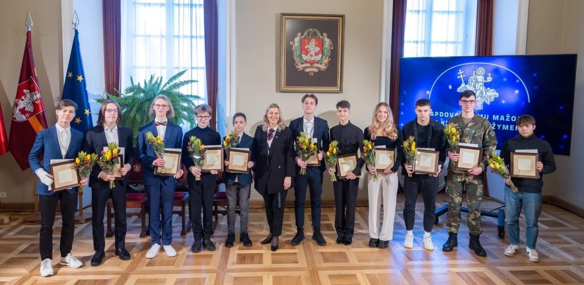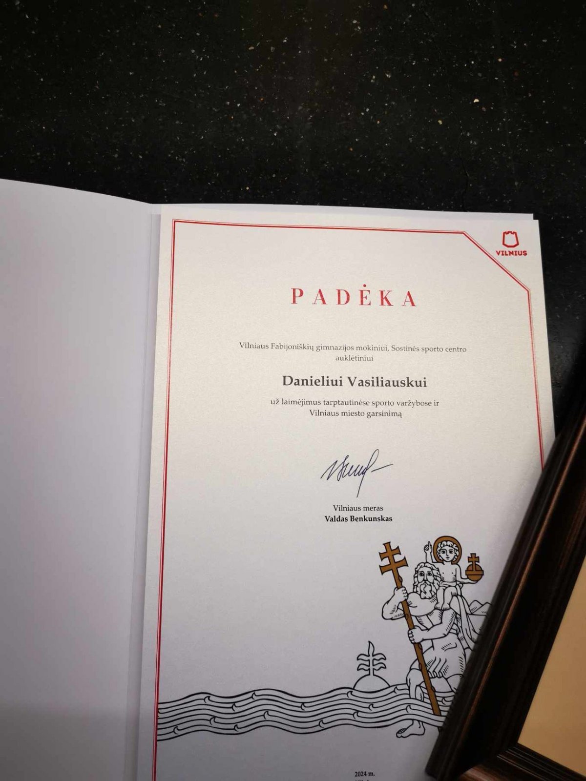 Sveikiname mūsų gimnazijos IIIb klasės moksleivį Danielių Vasiliauską, kuriam Kovo 11-ąją Vilniaus Rotušėje buvo įteiktas Mažasis Šv. Kristoforo žymuo ir Vilniaus mero Valdo Benkunsko Padėka už laimėjimus sporto varžybose ir Vilniaus miesto garsinimą. Didžiuojamės ir linkime būti pirmam visuose bėgimo takeliuose!