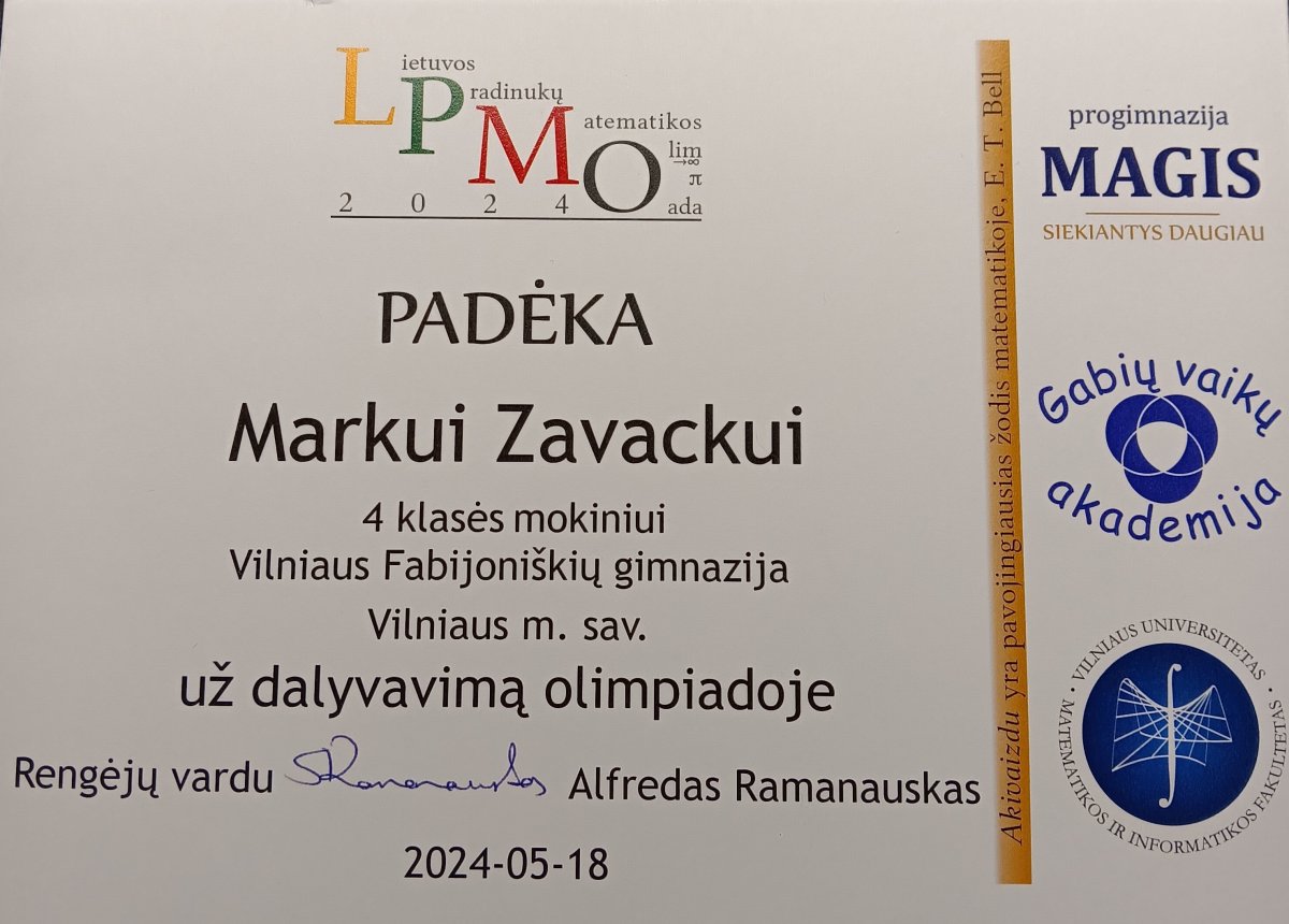 Šiais metais Vilniaus miesto matematikos olimpiadoje Markas užėmė 3-ąją vietą ir buvo pakviestas į Lietuvos pradinukų matematikos olimpiadą. Šioje olimpiadoje ketvirtokas sudalyvavo garbingai, bet tai tik pirmieji žingsniai, tik maži sparneliai, kurie tikimės užaugs ir nuskraidins Marką į matematikos plačiąsias padanges.