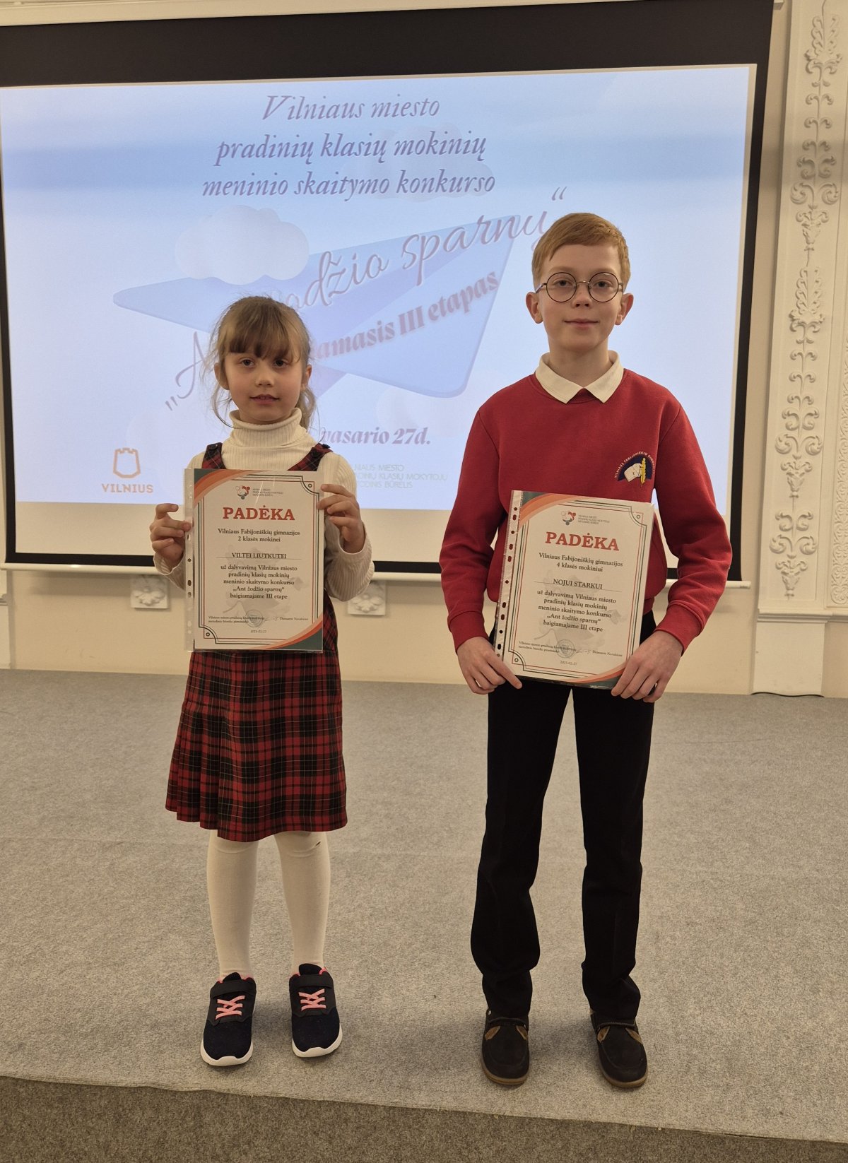 Fabijoniškių gimnaziją garsino 2b klasės mokinė Viltė Liutkutė ir 4b klasės mokinys Nojus Starkus.