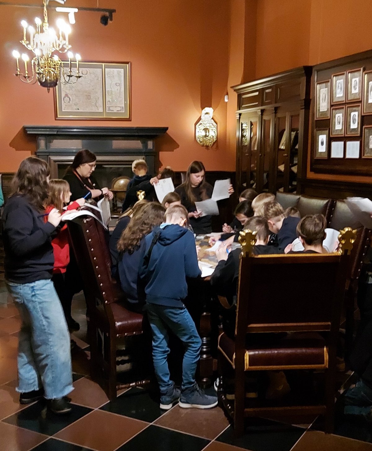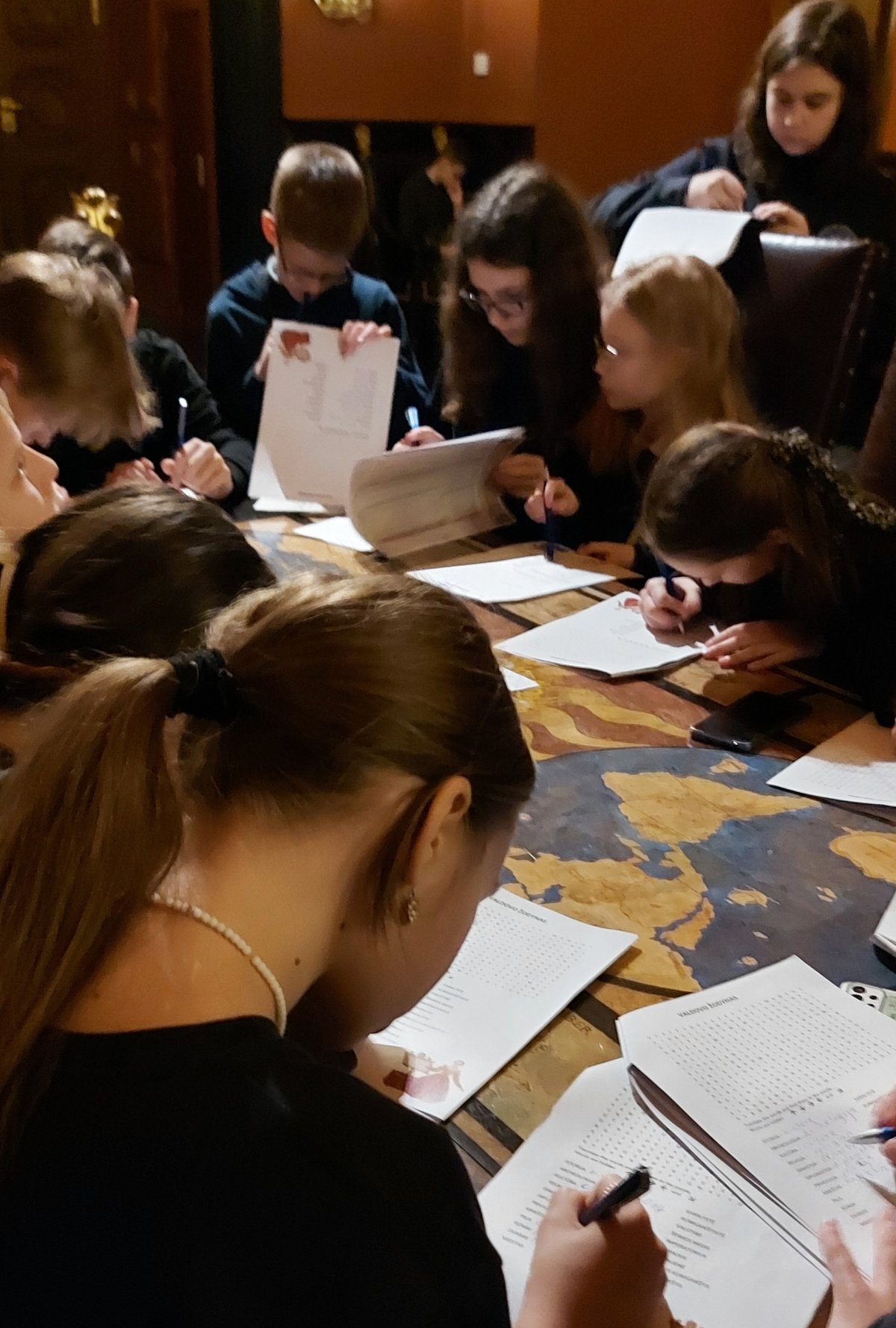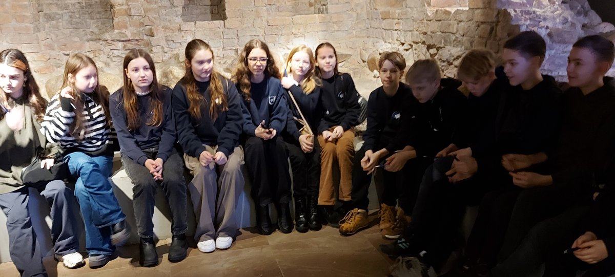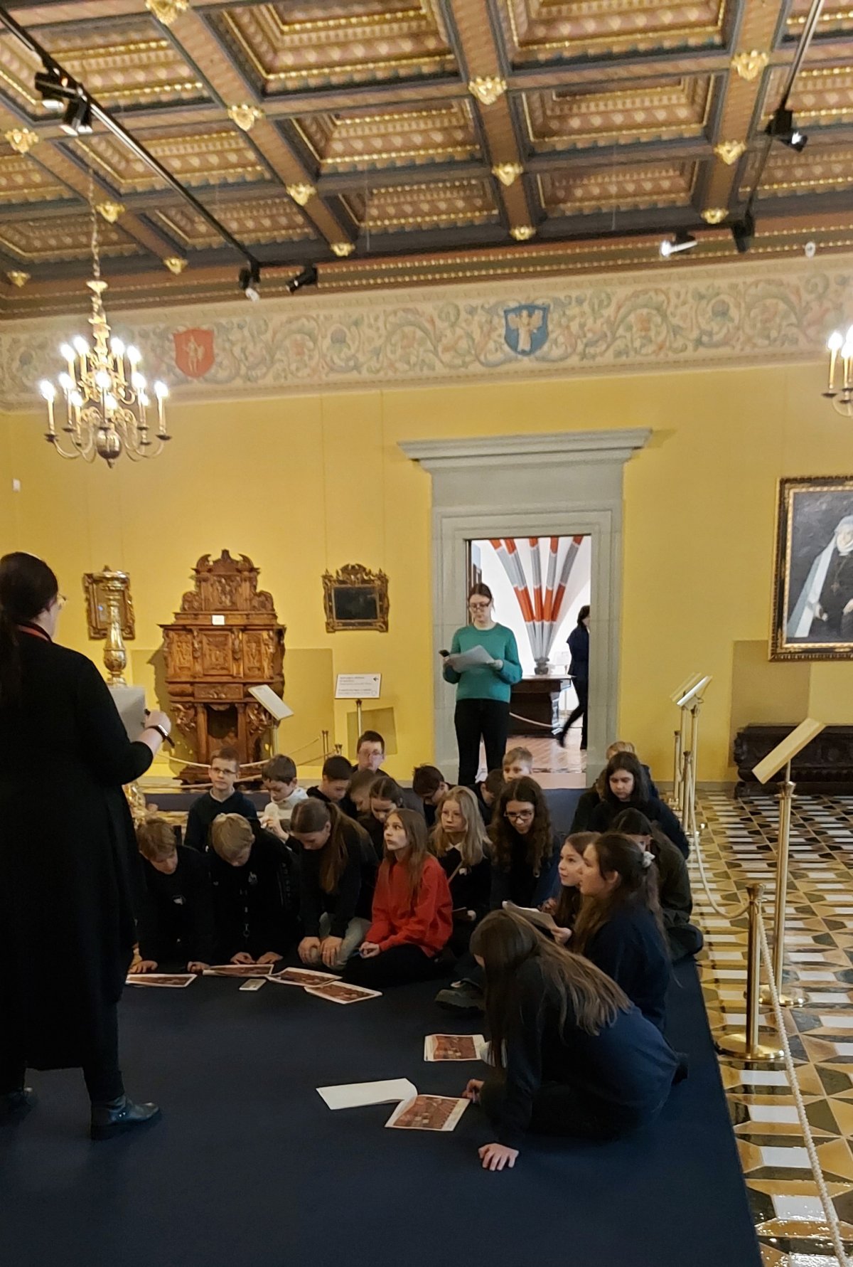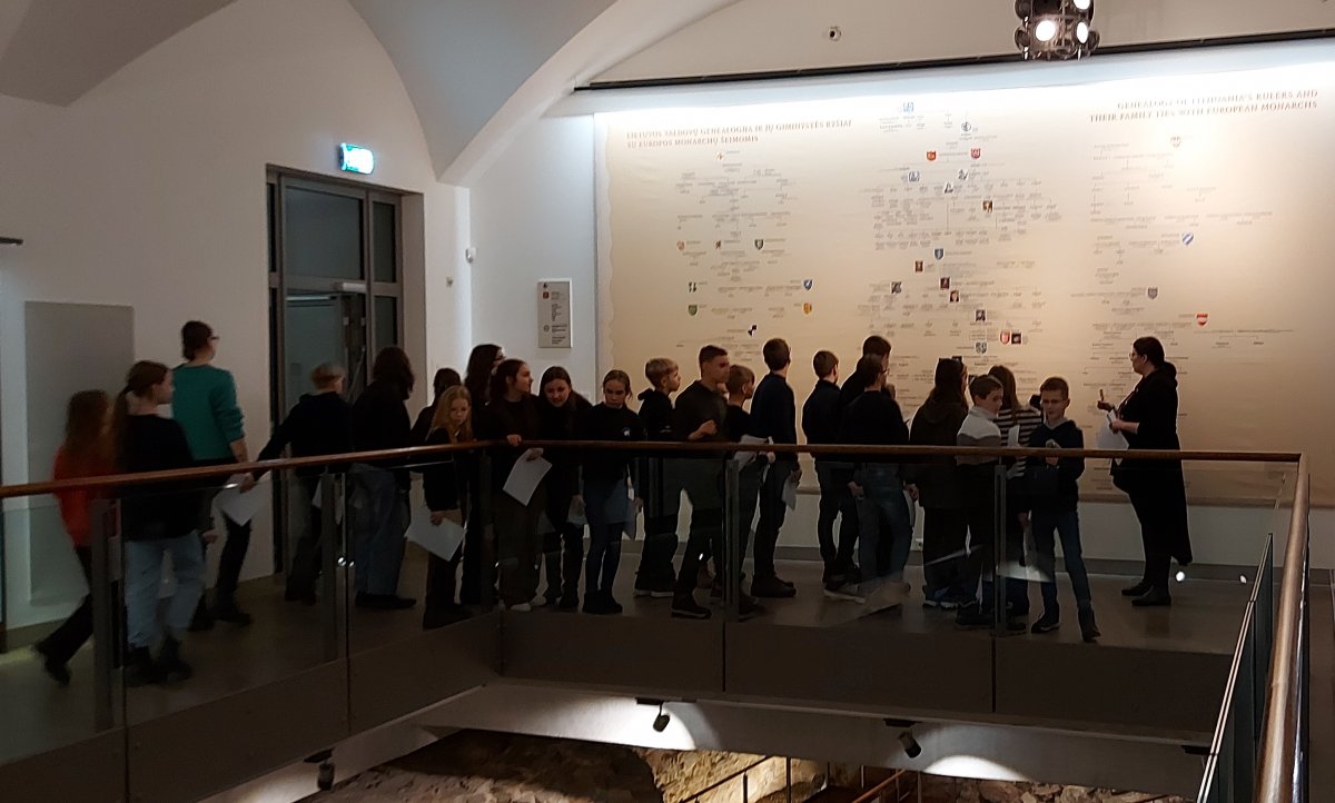 Žvarbų antradienio rytą, 5e klasės mokiniai kartu su auklėtoja Gabija Bartkevičiūte ir istorijos mokytoja Jolita Stadalninkaite vyko į Valdovų rūmų muziejų. „Ar žinote, kad nuo XVI a. pradžios, rūpindamiesi savo vaikų išsilavinimu visų Europos valstybių valdovai ypatingą dėmesį skyrė užsienio kalbų mokymuisi? Štai Žygimantas Augustas nuo 8 metų mokėsi lotynų, vokiečių ir italų kalbų. Juk valdovui reikės susikalbėti su pasauliu!“ Taip intriguojančiai prasidėjusi edukacija tema – „Valdovas kalba su pasauliu“ – prikaustė mokinių dėmesį.