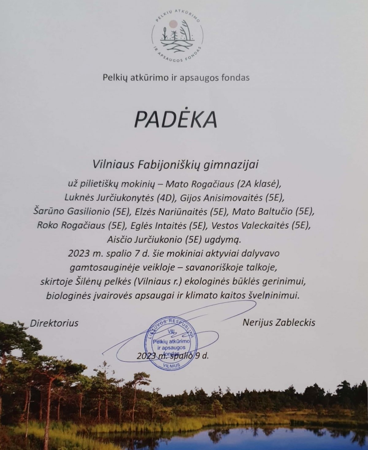 Gimnazijos mokiniai turėjo išskirtinę galimybę padėti pelkėms. Jie, kartu su savo tėveliais, dalyvavo talkoje, kurią organizavo VšĮ Pelkių atkūrimo ir apsaugos fondas. Talka vyko Šilėnų pelkėje, Vilniaus raj.