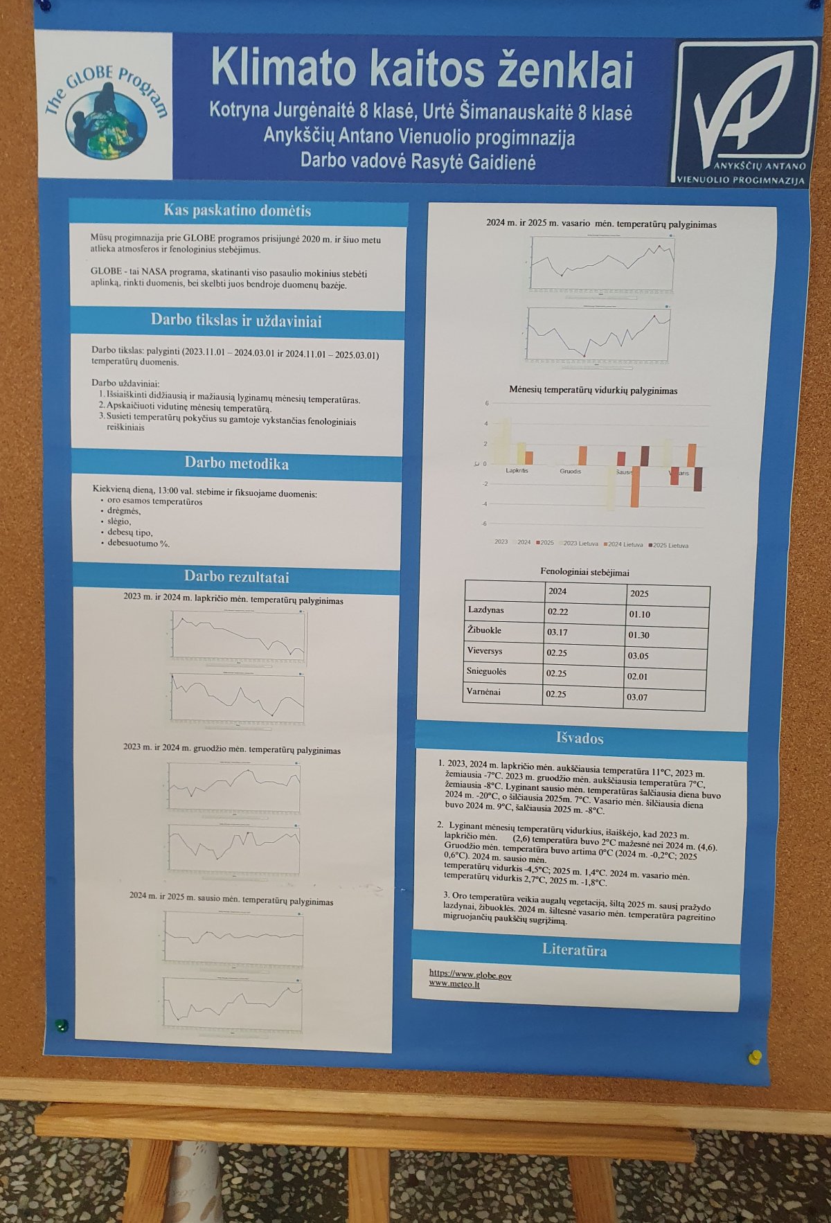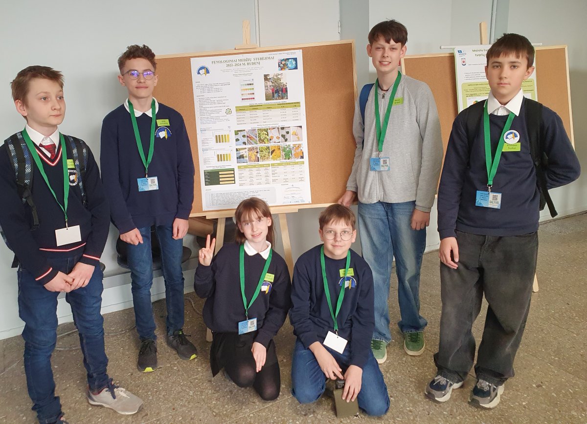 Džiaugiamės, kad joje dalyvavo ir mūsų gimnaziją atstovavo „GLOBE tyrimai“ būrelio nariai: Edvardas Dapševičius (6d kl.) Luknė Jurčiukonytė (5d kl.), Aistis Jurčiukonis (6e kl.), Matas Gricius (6e kl.), Justinas Radzevičius (5c kl.), Kristupas Šiurkus (6b kl.), vadovaujami biologijos mokytojos R. Alkimavičienės. Šie mokiniai pristatė stendinį pranešimą „Fenologiniai medžių stebėjimai 2022-2024 m. rudenį“, kuriame palygino trijų metų rudens fenologinių stebėjimų duomenis, pateikė jų analizę ir išvadas.