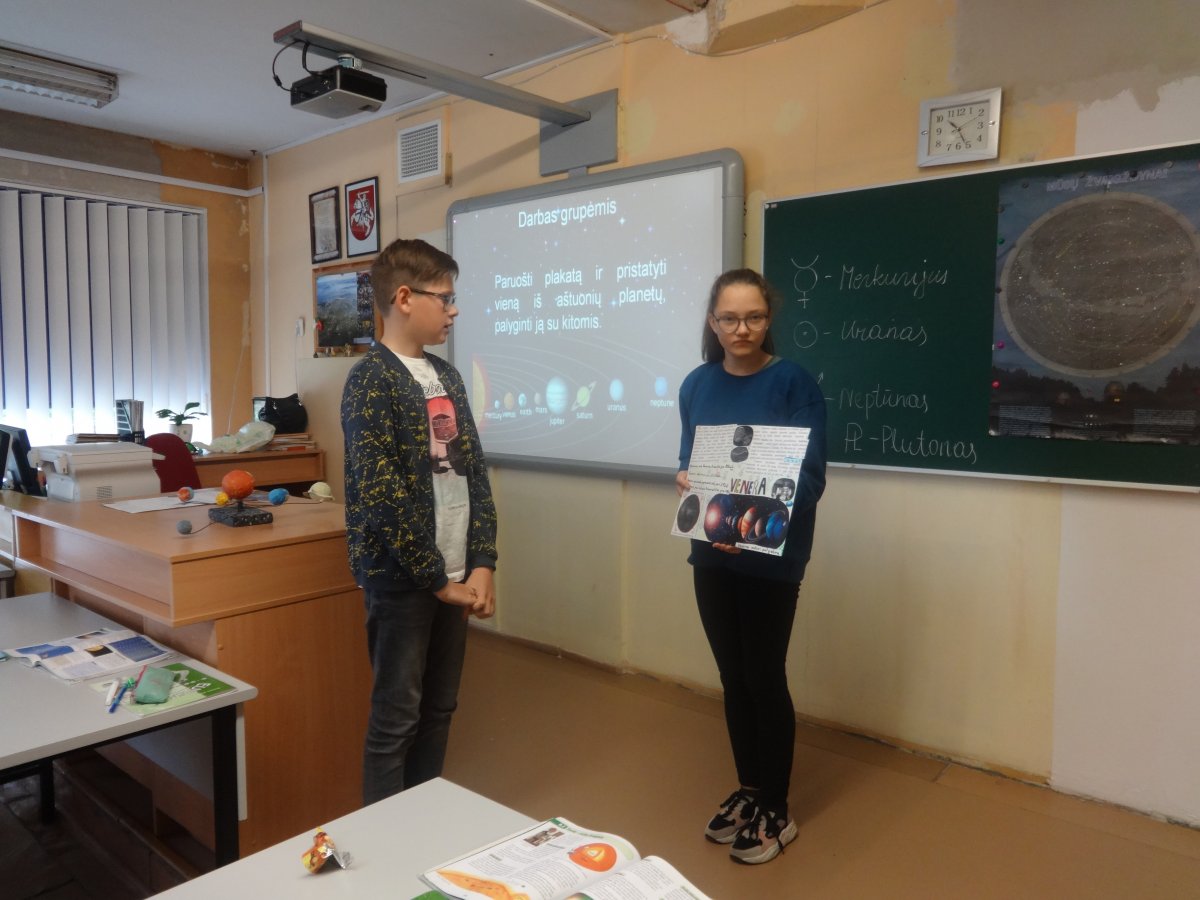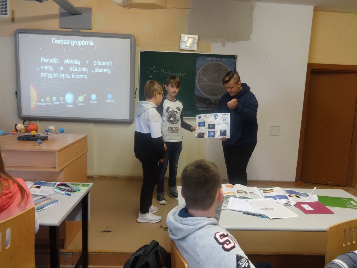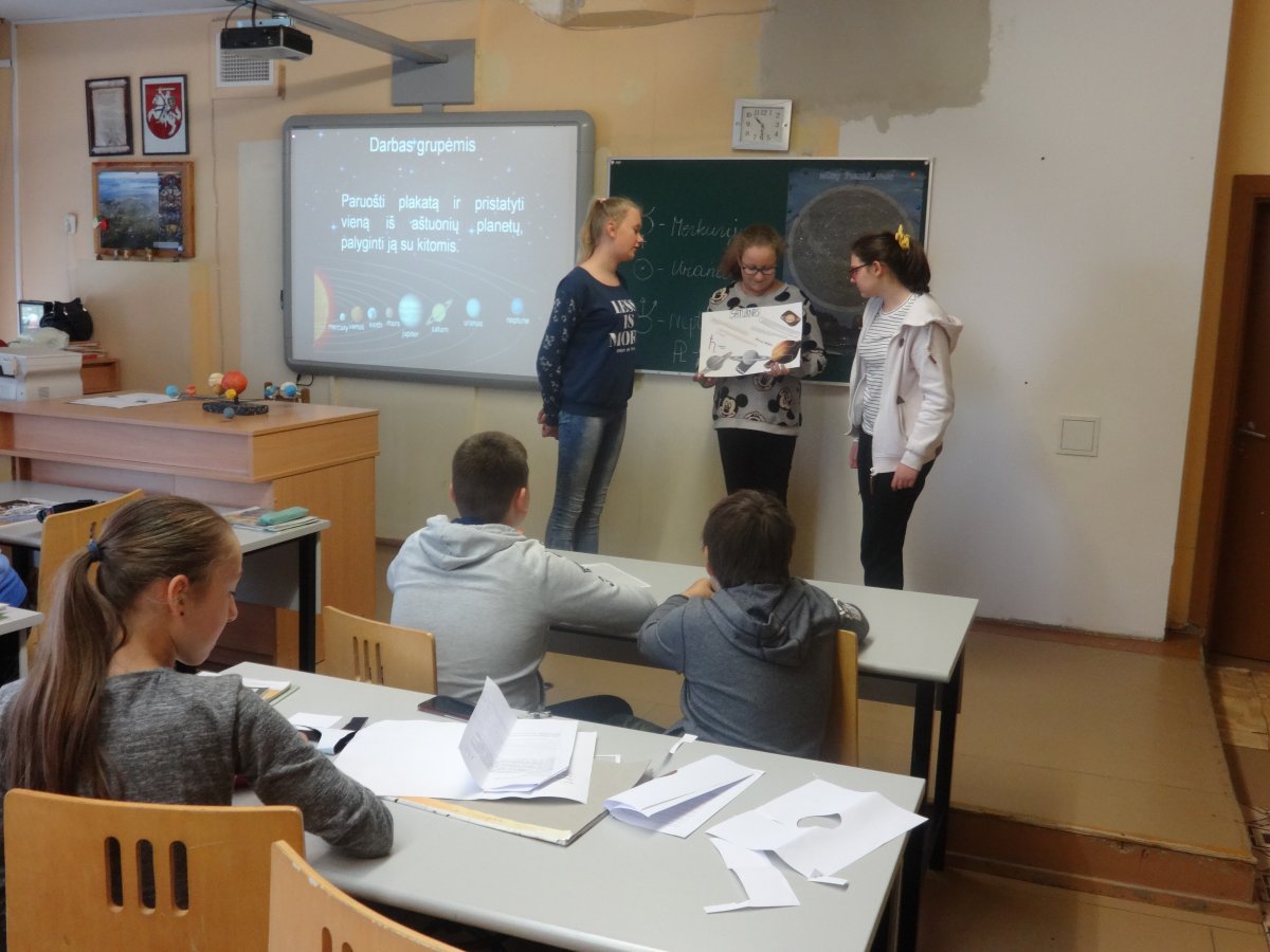 Gegužės 16 d. 6a klasėje vyko integruota fizikos ir gamtos pamoka ,,Saulės sistema”, kurią vedė biologijos mokytoja metodininkė Rūta Alkimavičienė ir fizikos mokytoja Daiva Stortienė. Per pamoką mokytojos supažindino vaikus su Saulės ir Mėnulio įtaka žmogui ir gamtai, o mokiniai, dirbdami grupėse, išsiaiškino, kuo skiriasi planeta nuo žvaigždės, kas sudaro Saulės sistemą, išvardino ir palygino jos planetas, pristatė klasėje paruoštus plakatus apie pasirinktą Saulės sistemos planetą. Mokiniai pagilino savo žinias ir kūrybiškai bendradarbiavo tarpusavyje.