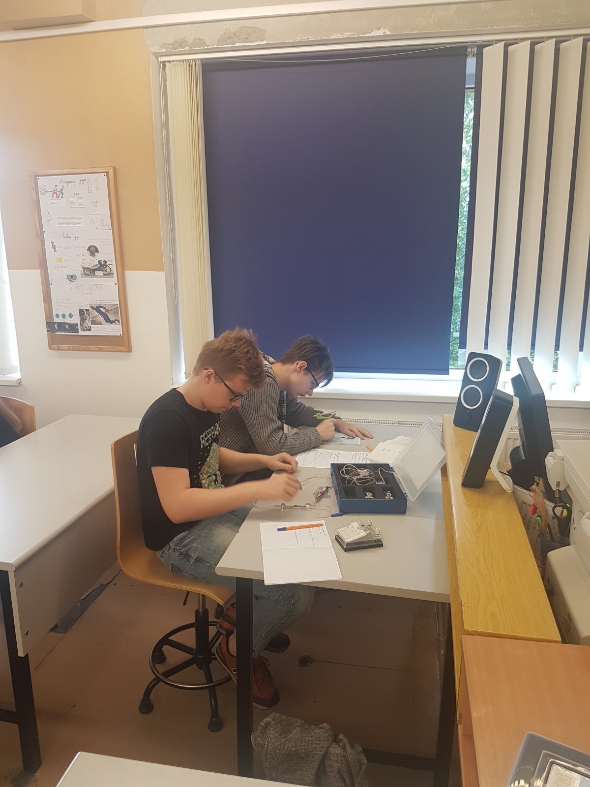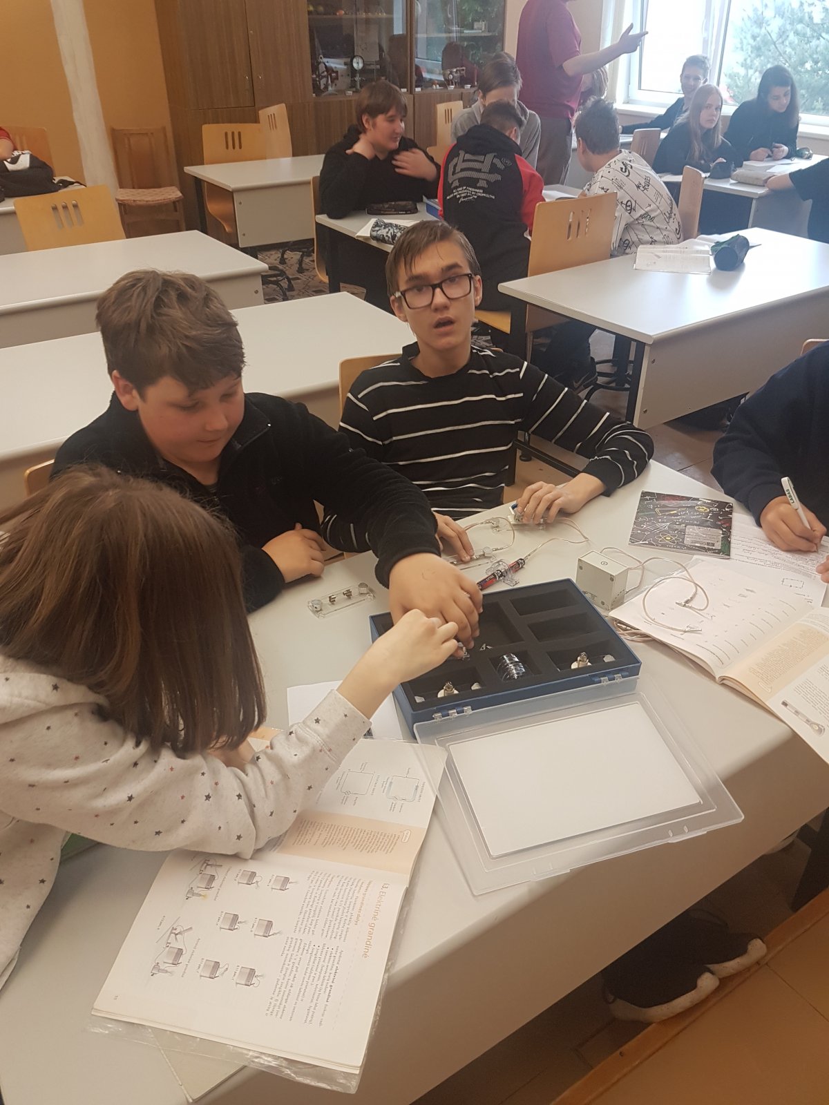 Gegužės 29 d. 7a ir 7b klasėse vyko integruota fizikos ir technologijų pamoka ,,Paprasčiausių elektros grandinių jungimas”, kurią vedė technologijų mokytojas Leonas Talakauskas ir fizikos mokytoja Daiva Stortienė. Per pamoką mokiniai dirbdami grupėse atliko praktinį darbą: nubrėžė ir paaiškino paprasčiausių elektrinių grandinių schemas. Tai paskatino mokinius kūrybiškai dirbti ir mokė tarpusavyje bendradarbiauti.