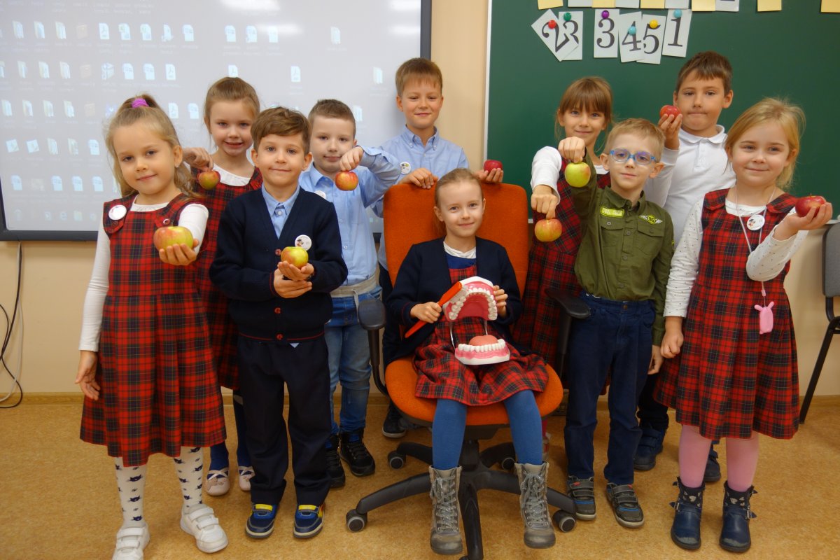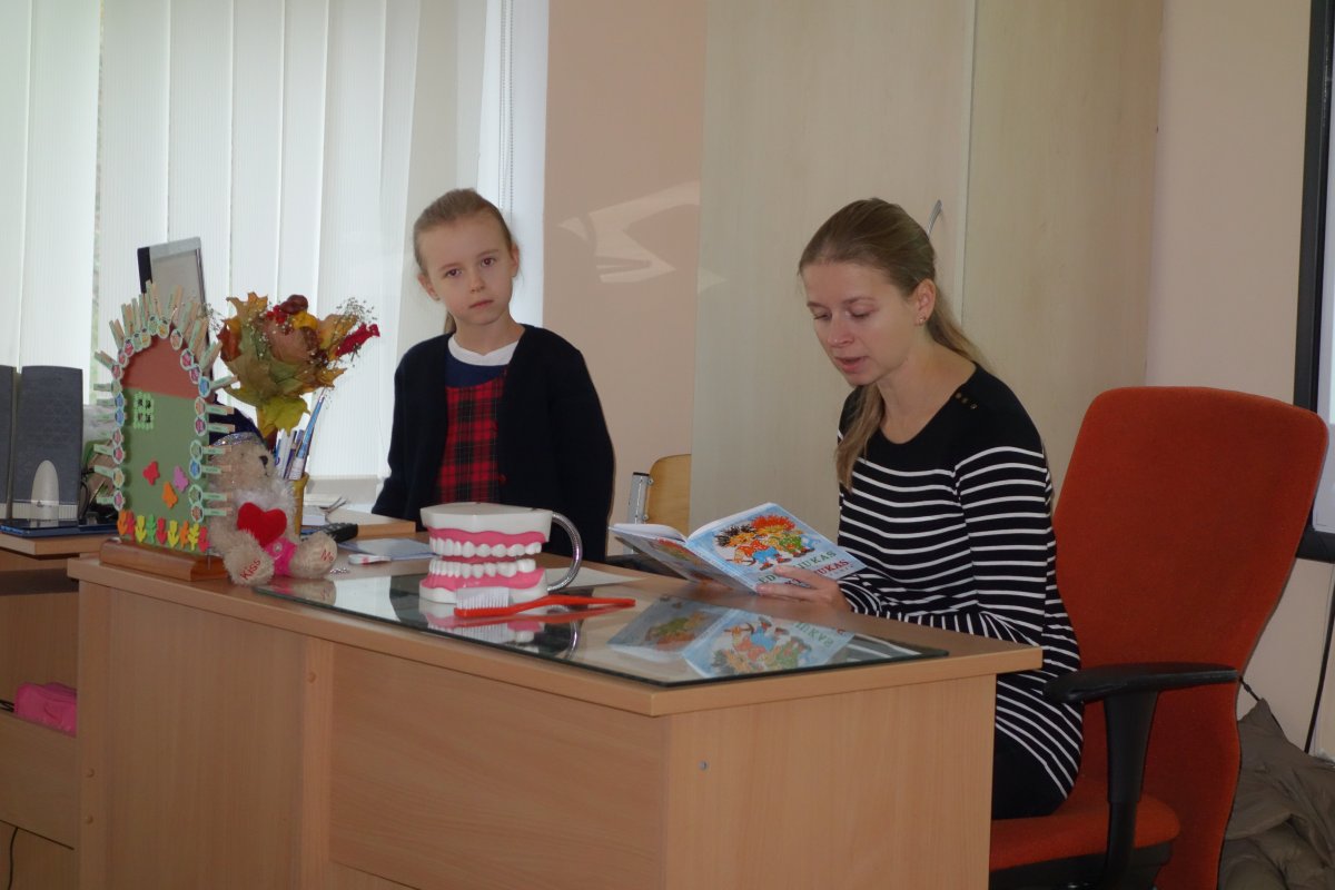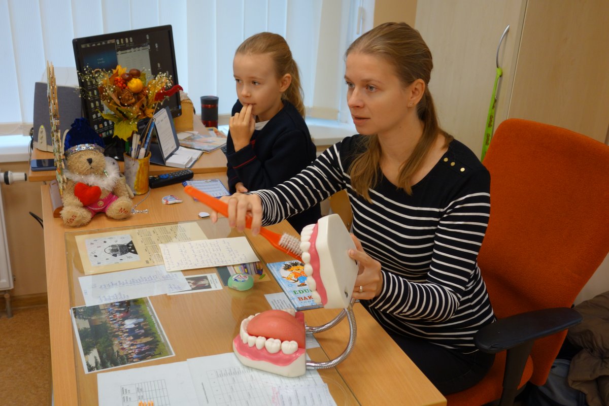 Spalio 7 d. į gimnaziją atskubėję 1b klasės mokiniai džiaugėsi mamytės – gydytojos odontologės pamokėle apie dantukų priežiūrą. Buvusi mūsų gimnazijos mokinė, dabar jau mama Jurgita Stanevičienė skaitė pasaką ,,Ėduoniukas ir Bakteriukas“, demonstravo kaip taisyklingai valyti dantukus šepetėliu ir tarpdančių siūlu. Dukrytė Gintarė padovanojo mokiniams dantų valymo kalendoriukus, kurie primins, kad dantukus reikia valyti kiekvieną dieną ryte ir vakare. Vaikai mėgavosi gimnazijoje dalinamais obuoliais.