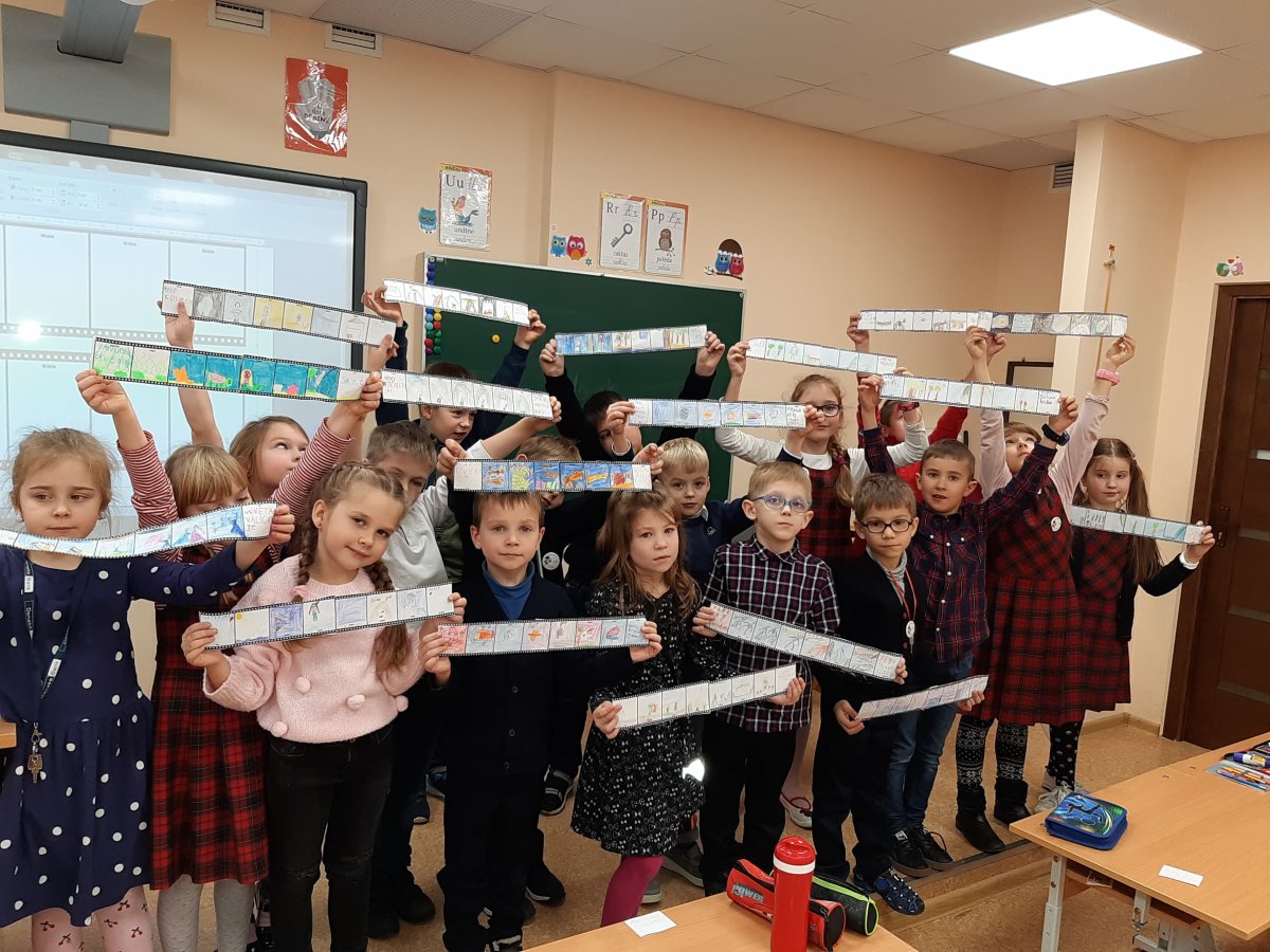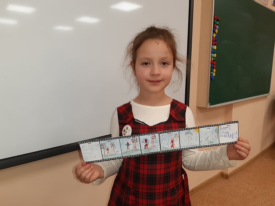 1b klasės mokiniai po edukacinio kino ,,Galaktos“ peržiūros patys kūrė kino juostas pasirinkta tema.