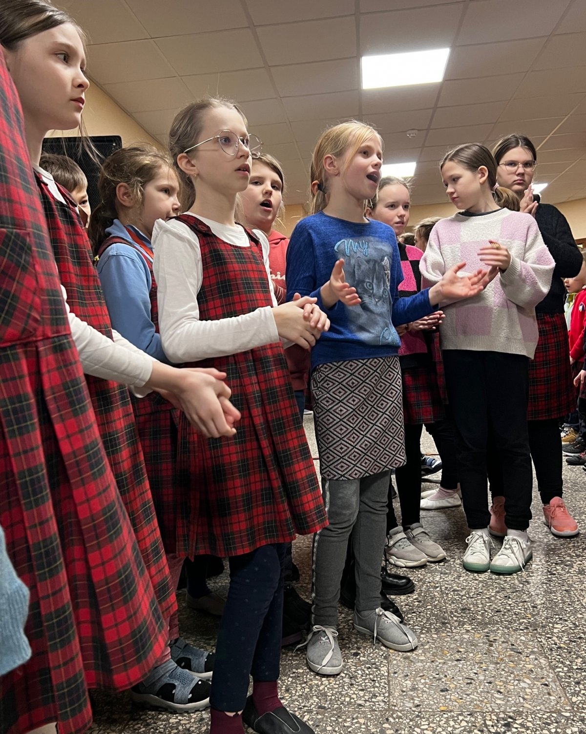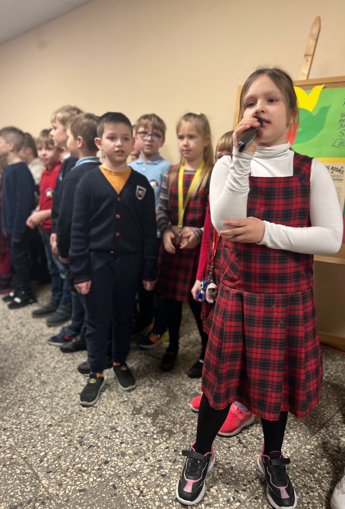 Istorijos ir muzikos mokytojų paruošta programa nusitęsė per visą dieną. Pirmosios pamokos metu mokiniai su mokytojais buvo kviečiami spręsti viktoriną ir kartu pakeliauti Lietuvos istorijos takais. Pertraukų metu, šalia mokytojų kambario, buvo rodomi trumpi video reportažai apie Vasario 16-ąją ir jos signatarus. Na, o ilgosios pertraukos metu, visi čia rinkosi padainuoti Lietuvą. 1b ir 2a klasės mokiniai su soliste Kamile Breskute (2a), bei gitara pritarusia Lina Čepukėnaite (8c) atliko Aistės Smilgevičiūtės ir grupės „Skylė“ kūrinį „Sudainuokime Lietuvą“. IIa klasės mokinė Gabija Vyšniauskaitė kartu su muzikos mokytoju Viktoru Lapėnu dainavo Marijono Mikutavičiaus kūrinį „Ar mylit ją Jūs?“, o taip pat pagal Vido Bareikio sukurtą muziką repavo Antano Baranausko „Anykščių šilelį“, o jiems pritarė ir susirinkusieji.
