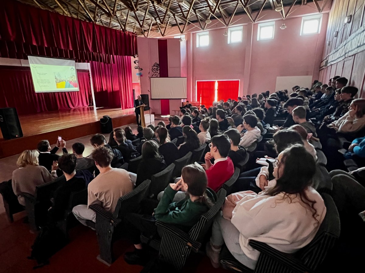 Vyresniųjų klasių mokiniai buvo pakviesti į aktų salę paklausyti prof. Dr. Raimundo Lopatos ir buvusio krepšininko Rolando Skaisgirio paskaitos apie sporto istoriją ir jo svarbą šių laikų jaunimo ir kiekvieno žmogaus gyvenime.