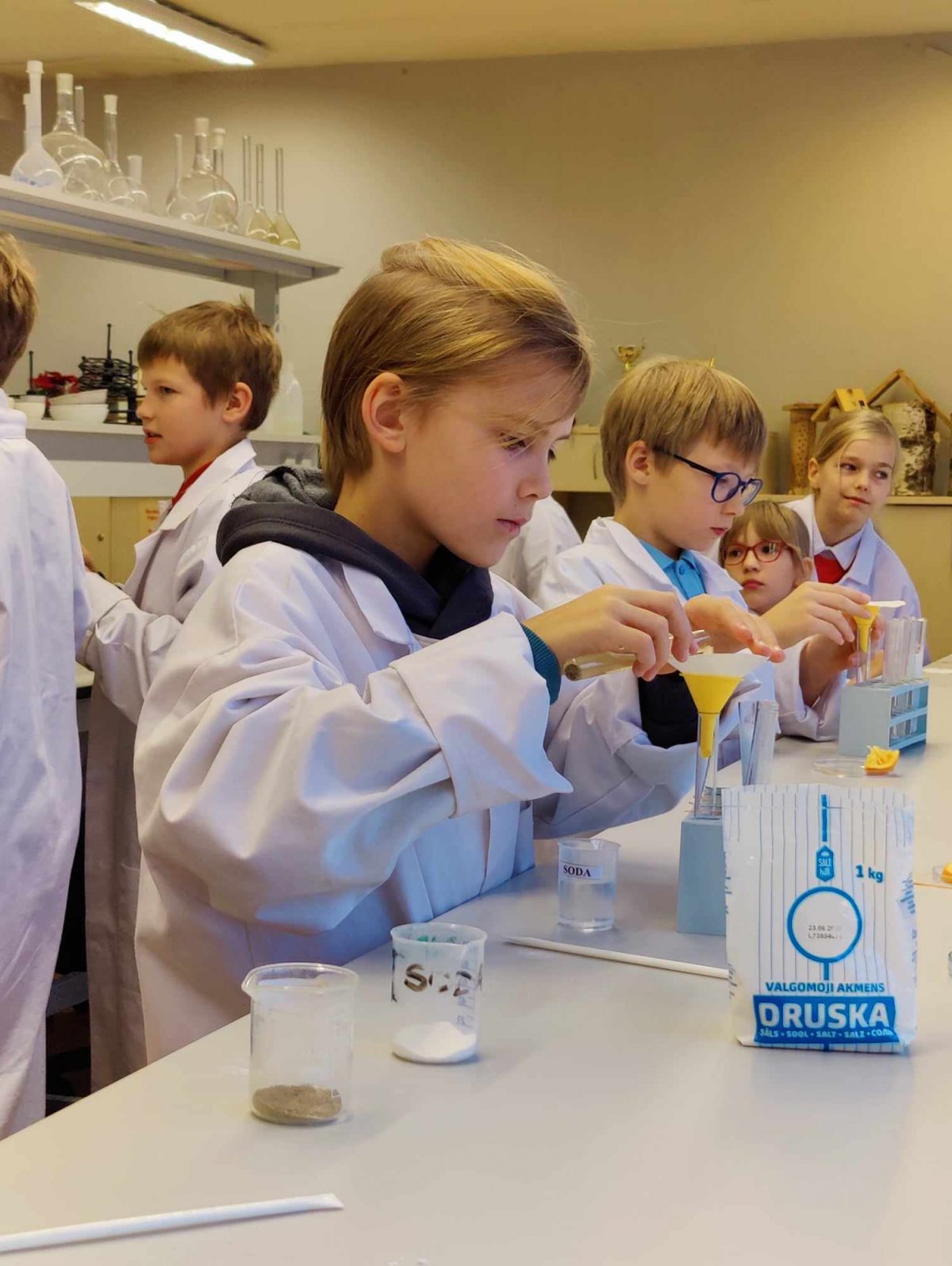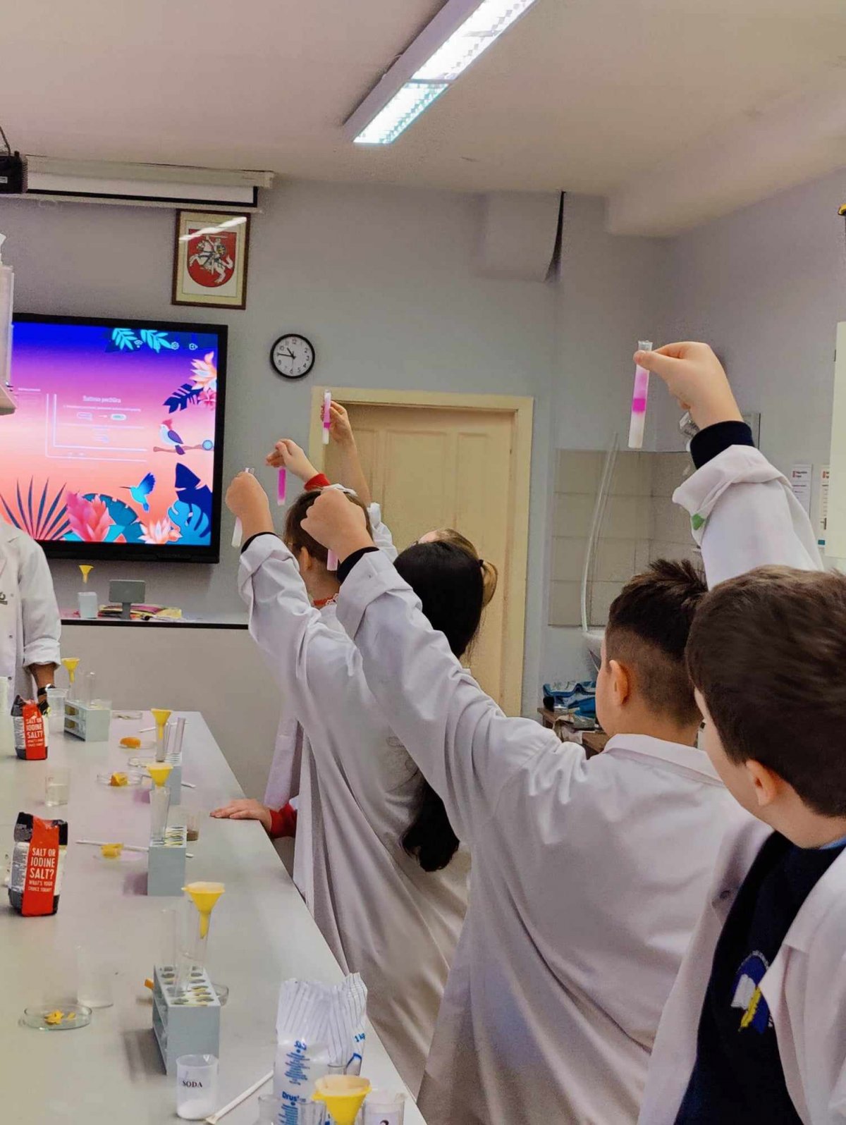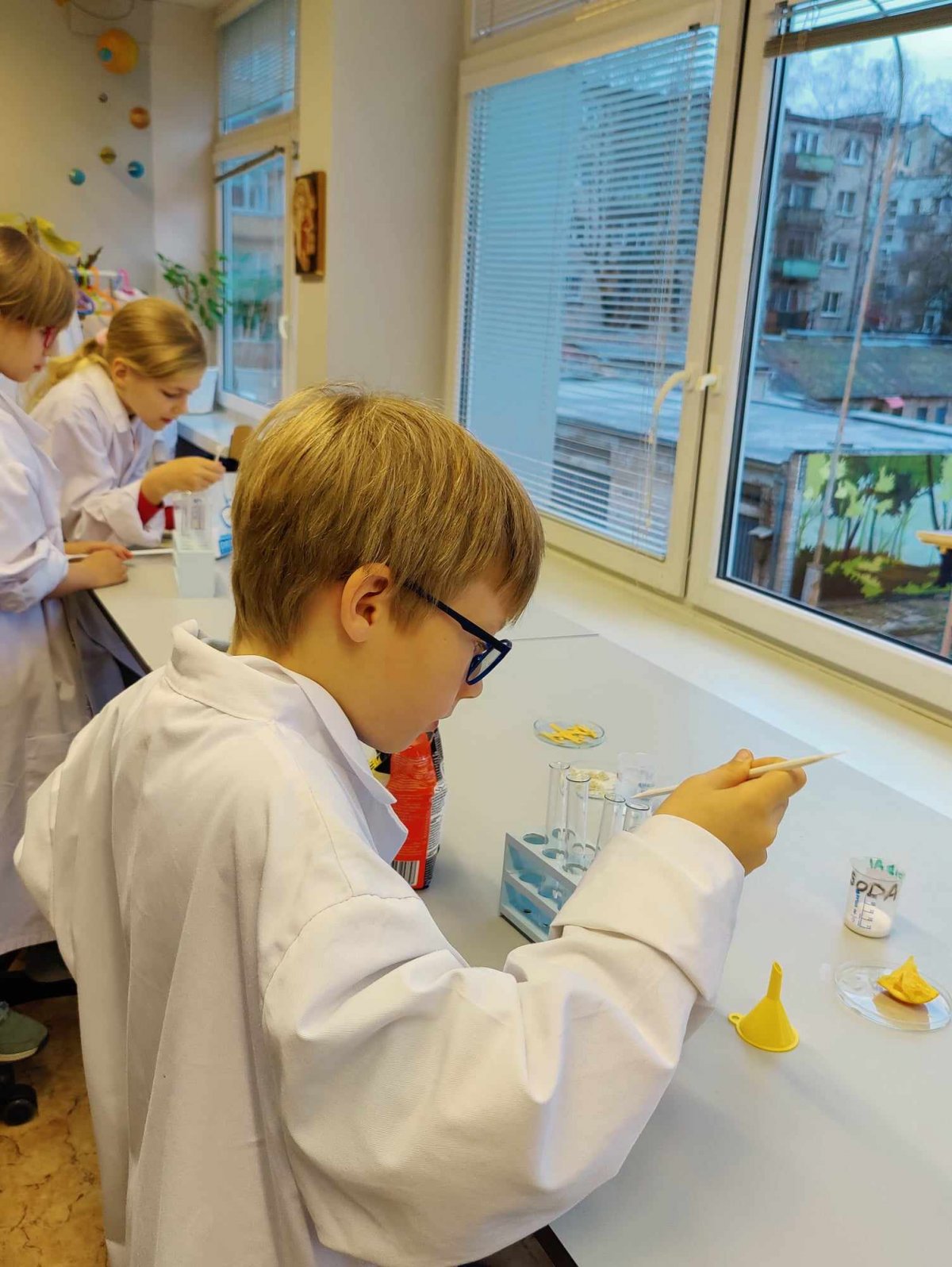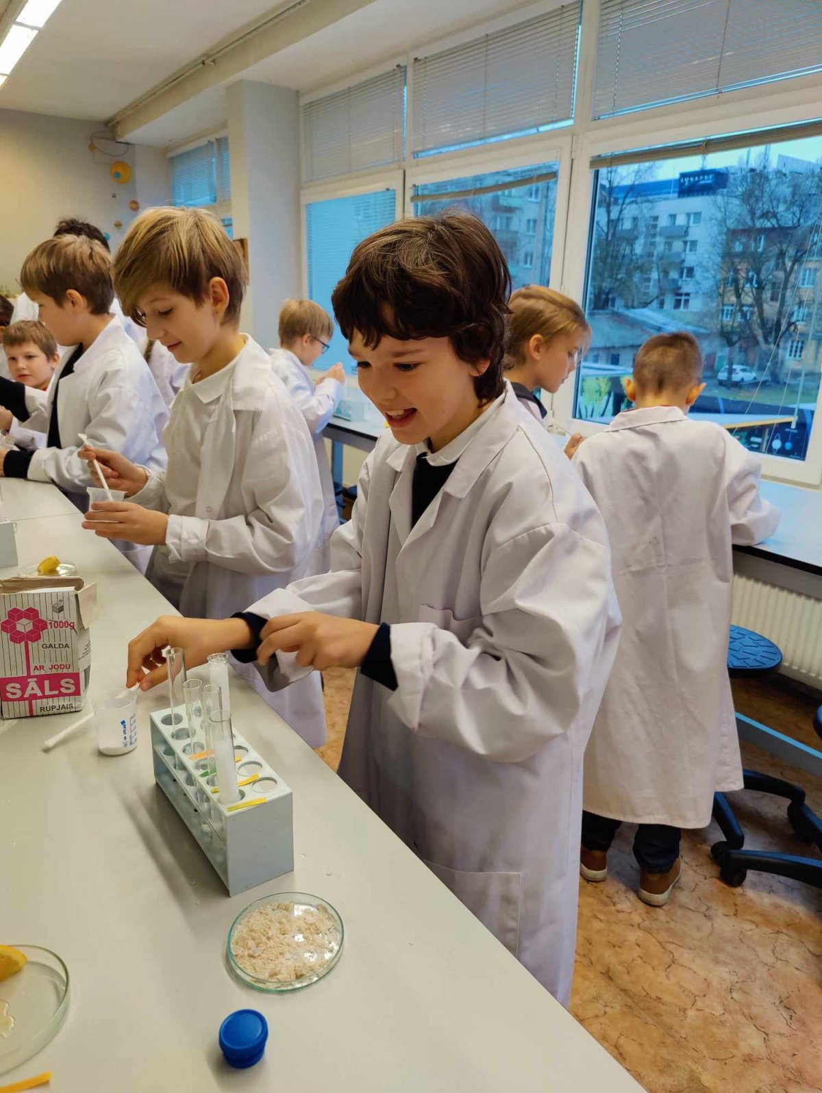 Chemijos pamokos metu ketvirtokai atliko skirtingus eksperimentus su tirpalais ir tirpikliais. Vaikai sužinojo, kad kiekviena medžiaga skirtinguose tirpikliuose tirpsta nevienodai. Kai kurioms medžiagoms tirpumas nebūdingas. Stebėdami, kaip rūgštiniai ir šarminiai tirpalai keičia indikatorių spalvą, jie išsiaiškino, kaip naudojantis gamtiniais indikatoriais (citrina, druska, soda, kreida ir pan.) galima nustatyti, koks yra tirpalas – šarminis ar rūgštinis. Chemijos mokytoja, direktoriaus pavaduotoja ugdymui Vilma Martinkėnienė vaikams paprastai ir suprantamai pasakojo apie chemijos procesus, suteikė galimybę įsikūnyti į mokslininko profesiją.