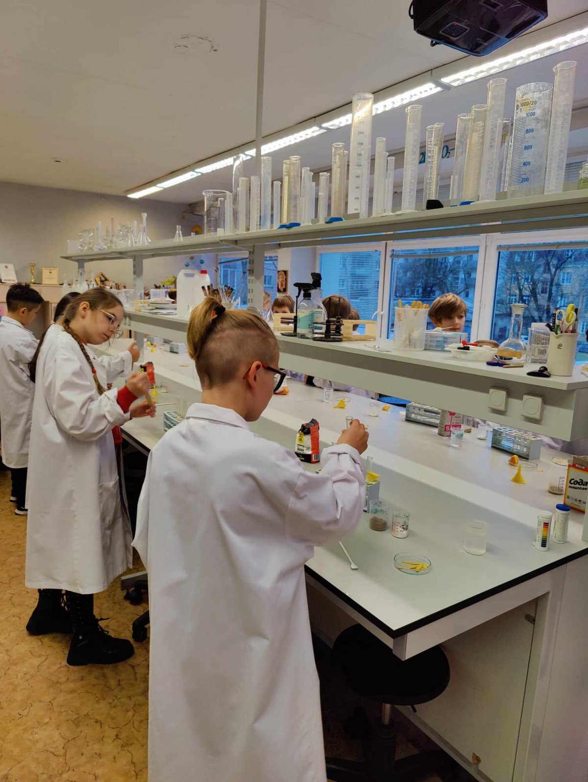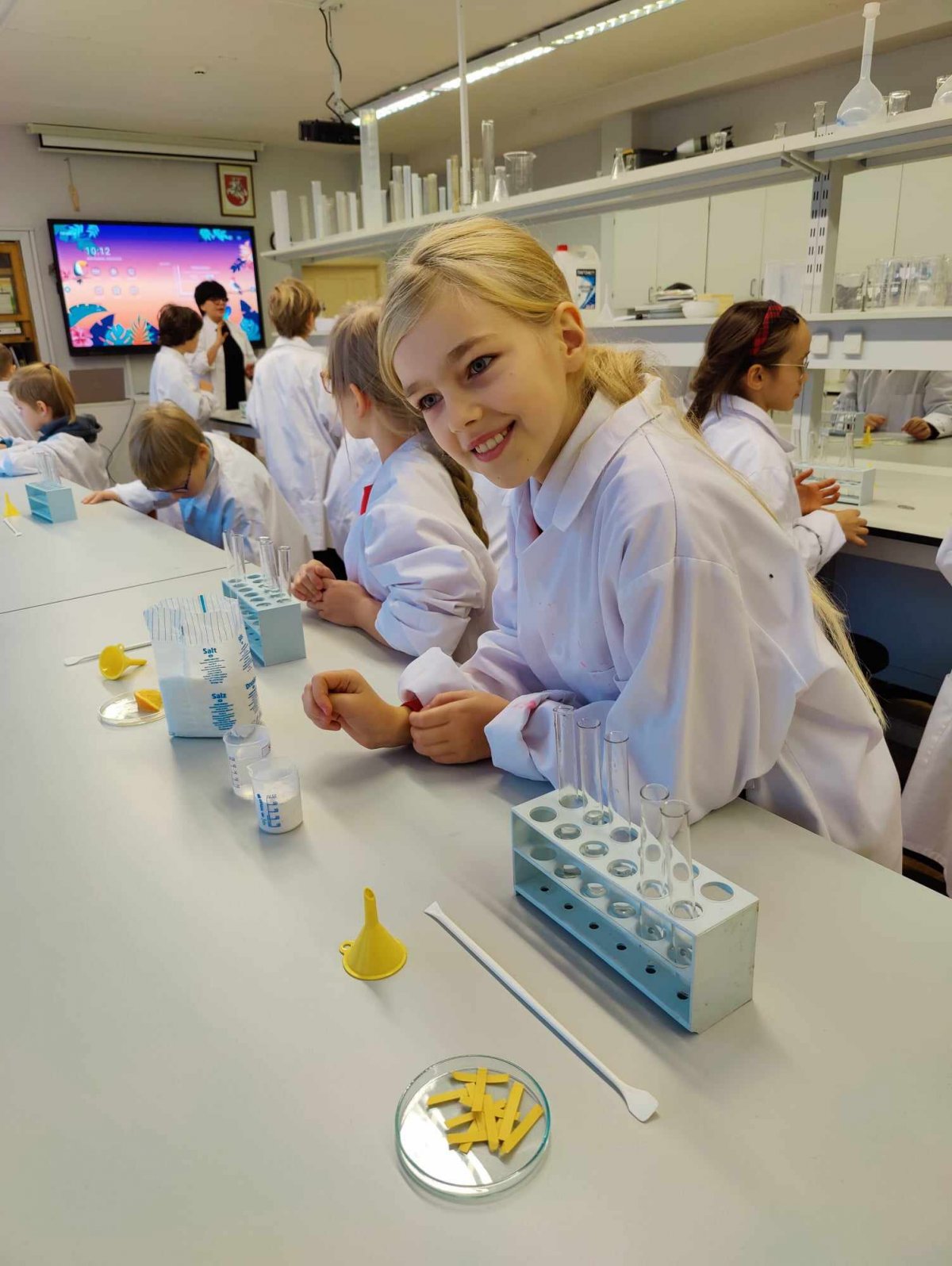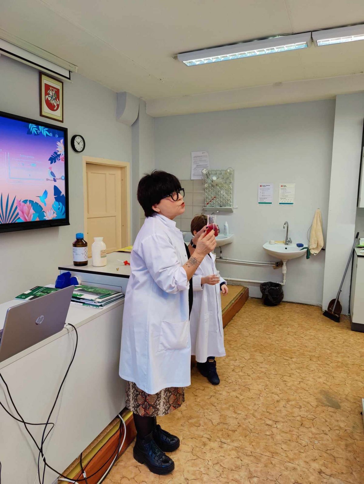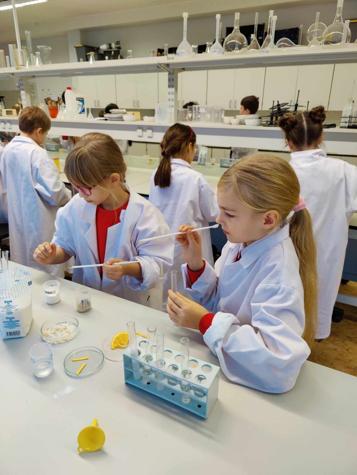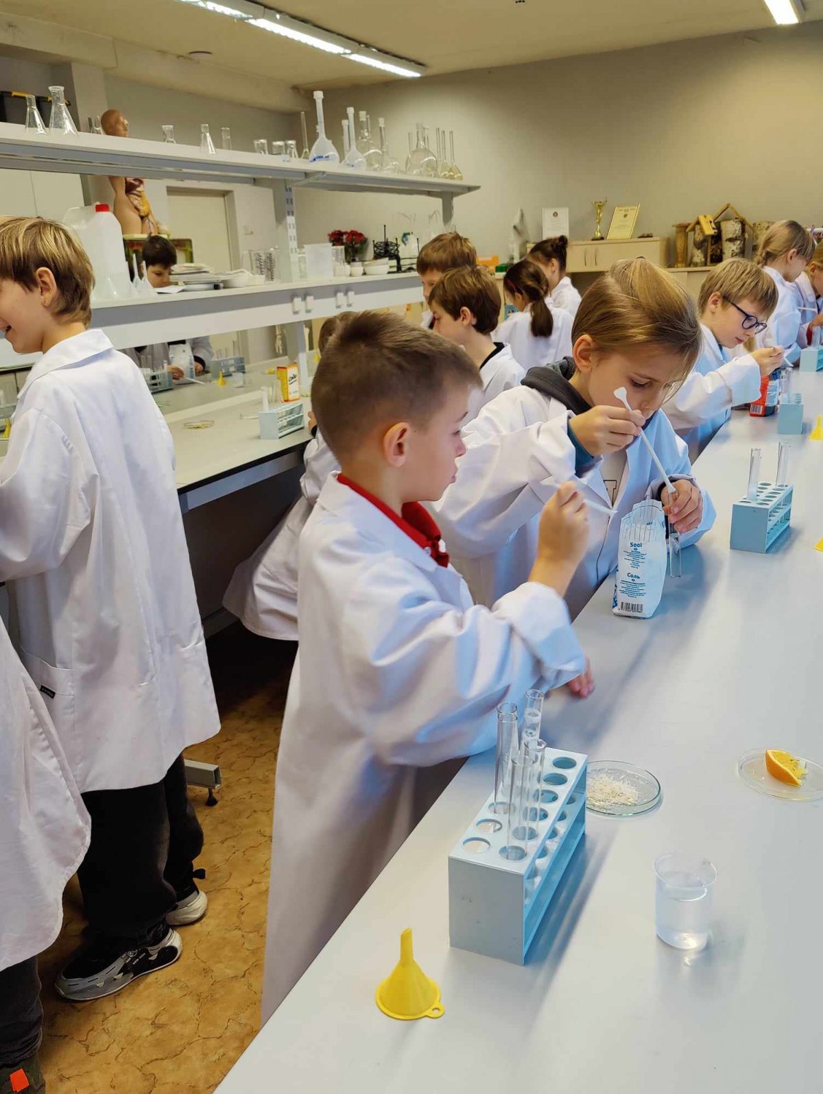 Chemijos pamokos metu ketvirtokai atliko skirtingus eksperimentus su tirpalais ir tirpikliais. Vaikai sužinojo, kad kiekviena medžiaga skirtinguose tirpikliuose tirpsta nevienodai. Kai kurioms medžiagoms tirpumas nebūdingas. Stebėdami, kaip rūgštiniai ir šarminiai tirpalai keičia indikatorių spalvą, jie išsiaiškino, kaip naudojantis gamtiniais indikatoriais (citrina, druska, soda, kreida ir pan.) galima nustatyti, koks yra tirpalas – šarminis ar rūgštinis. Chemijos mokytoja, direktoriaus pavaduotoja ugdymui Vilma Martinkėnienė vaikams paprastai ir suprantamai pasakojo apie chemijos procesus, suteikė galimybę įsikūnyti į mokslininko profesiją.