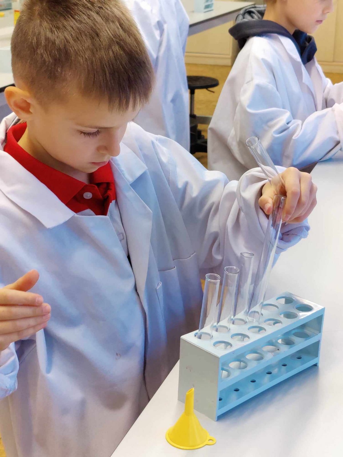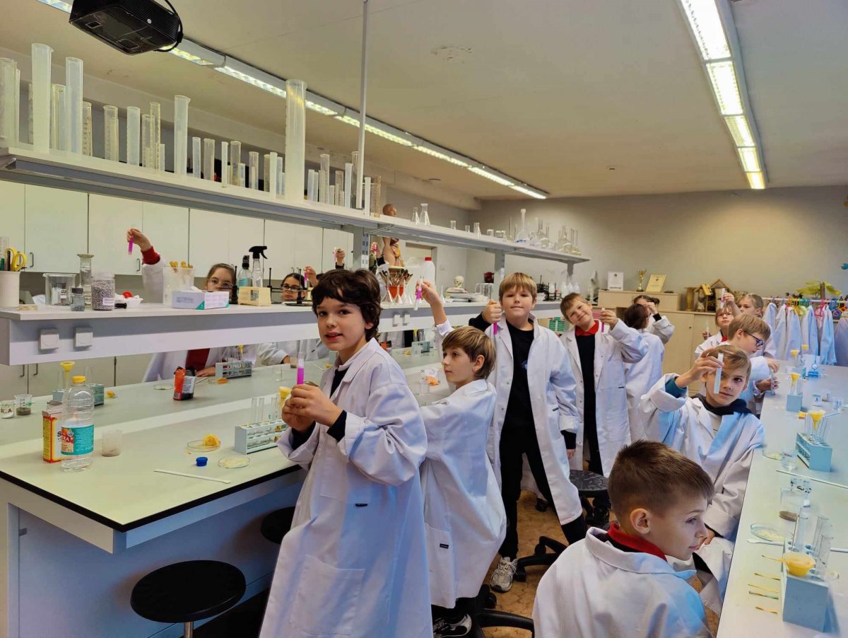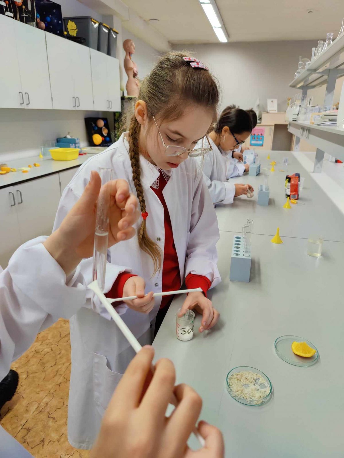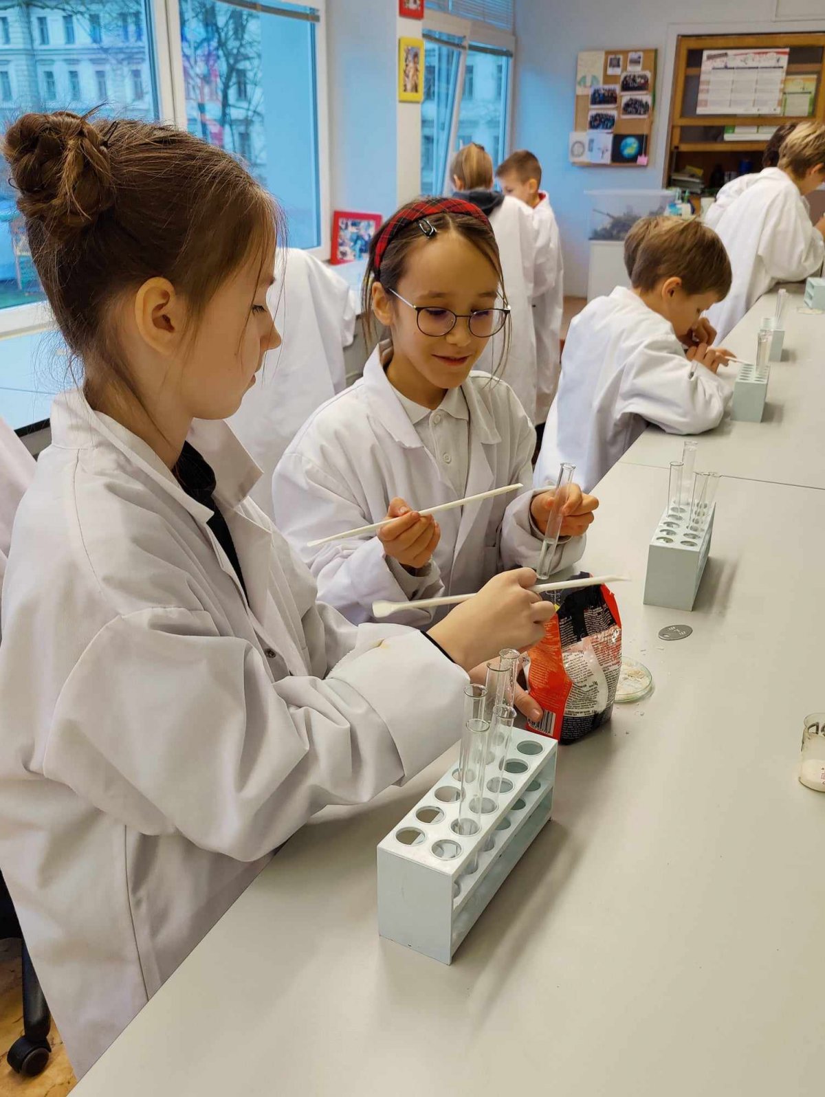 Chemijos pamokos metu ketvirtokai atliko skirtingus eksperimentus su tirpalais ir tirpikliais. Vaikai sužinojo, kad kiekviena medžiaga skirtinguose tirpikliuose tirpsta nevienodai. Kai kurioms medžiagoms tirpumas nebūdingas. Stebėdami, kaip rūgštiniai ir šarminiai tirpalai keičia indikatorių spalvą, jie išsiaiškino, kaip naudojantis gamtiniais indikatoriais (citrina, druska, soda, kreida ir pan.) galima nustatyti, koks yra tirpalas – šarminis ar rūgštinis. Chemijos mokytoja, direktoriaus pavaduotoja ugdymui Vilma Martinkėnienė vaikams paprastai ir suprantamai pasakojo apie chemijos procesus, suteikė galimybę įsikūnyti į mokslininko profesiją.