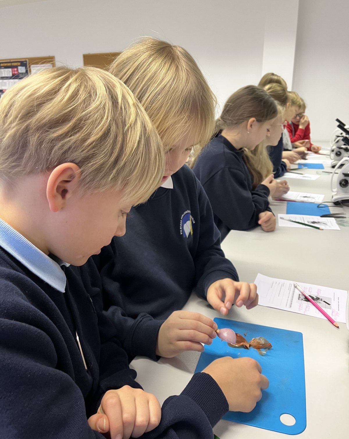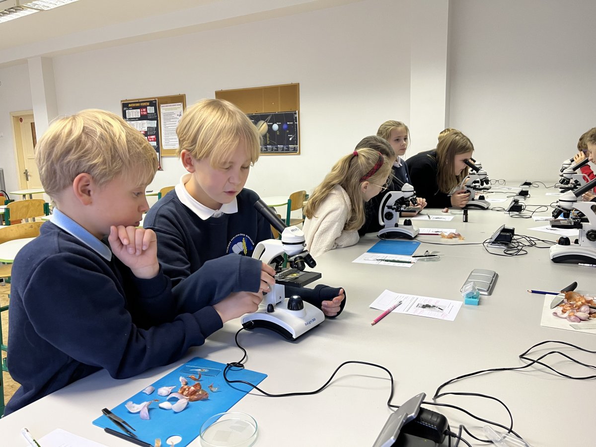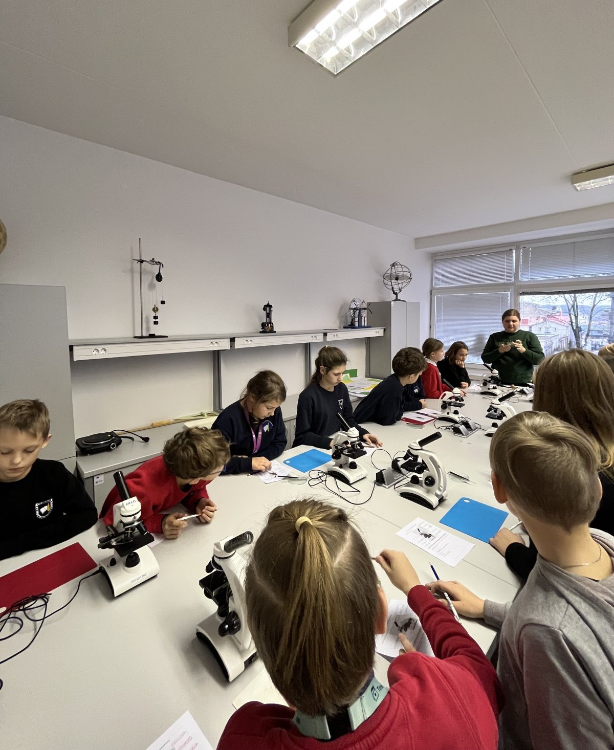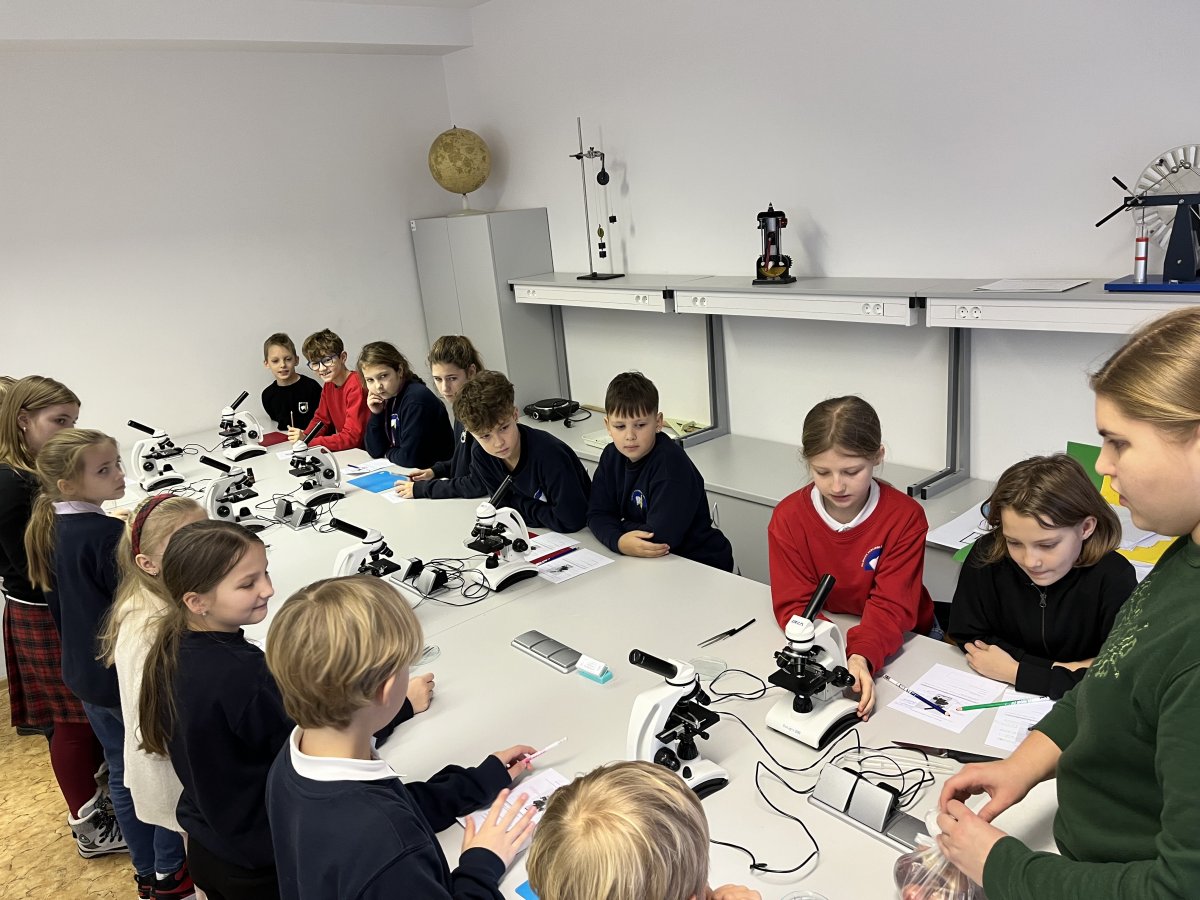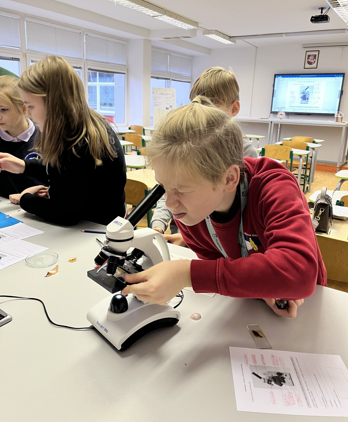Ketvirtokai aktyviai dalyvavo biologijos pamokoje, kurioje susipažino su mikroskopo dalimis ir turėjo puikią galimybę patyrinėti svogūno lukšto branduolį. Mokiniams patiems teko išsiimti skaidriąją svogūno lukšto plėvelę ir, klausantis biologijos mokytojos nurodymų, atlikti užduotis mikroskopu. Nors daugumai tai teko daryti pirmą kartą, bet visiems pavyko atrasti lukšto branduolį ir sienelę. Ketvirtokai buvo sužavėti vaizdu per mikroskopą- net keitėsi mikroskopais ir stebėjo vieni kitų matomą vaizdą. Biologijos pamoka labai greitai prabėgo, buvo sklandi ir įdomi. Tokių pamokų norėtų ir dažniau.