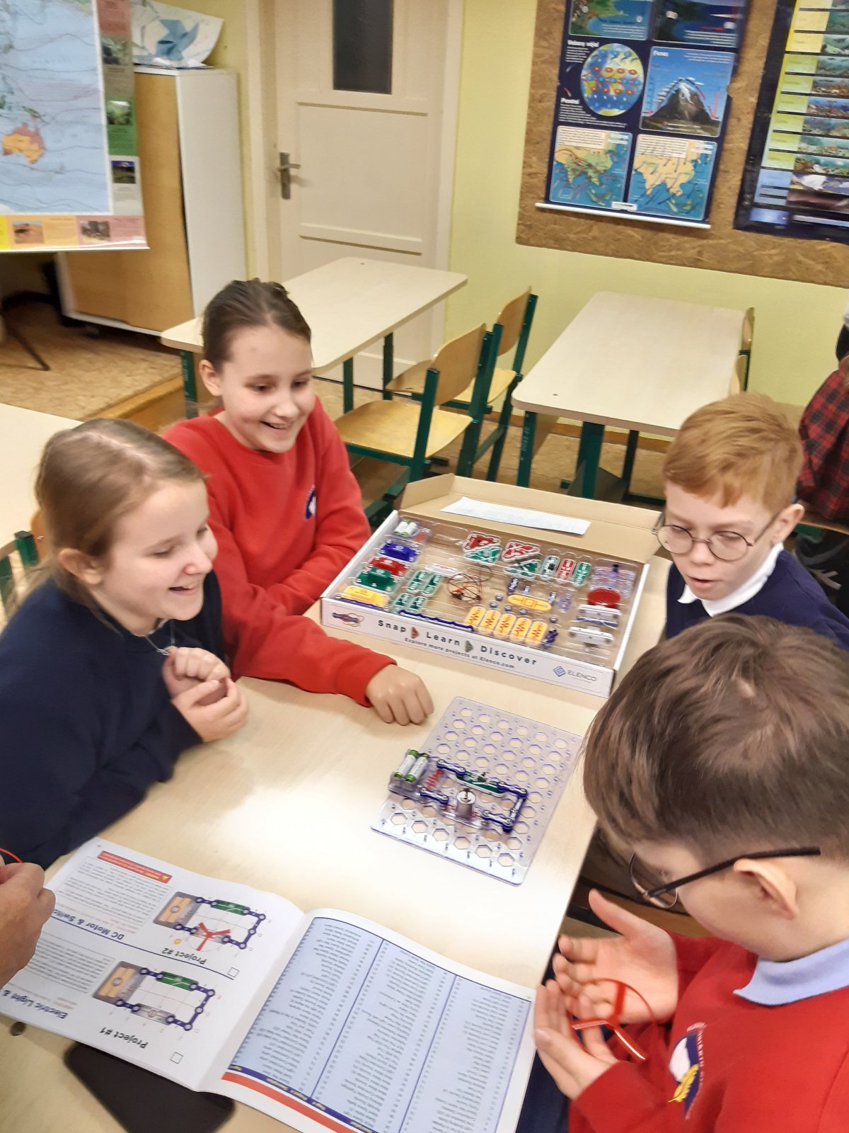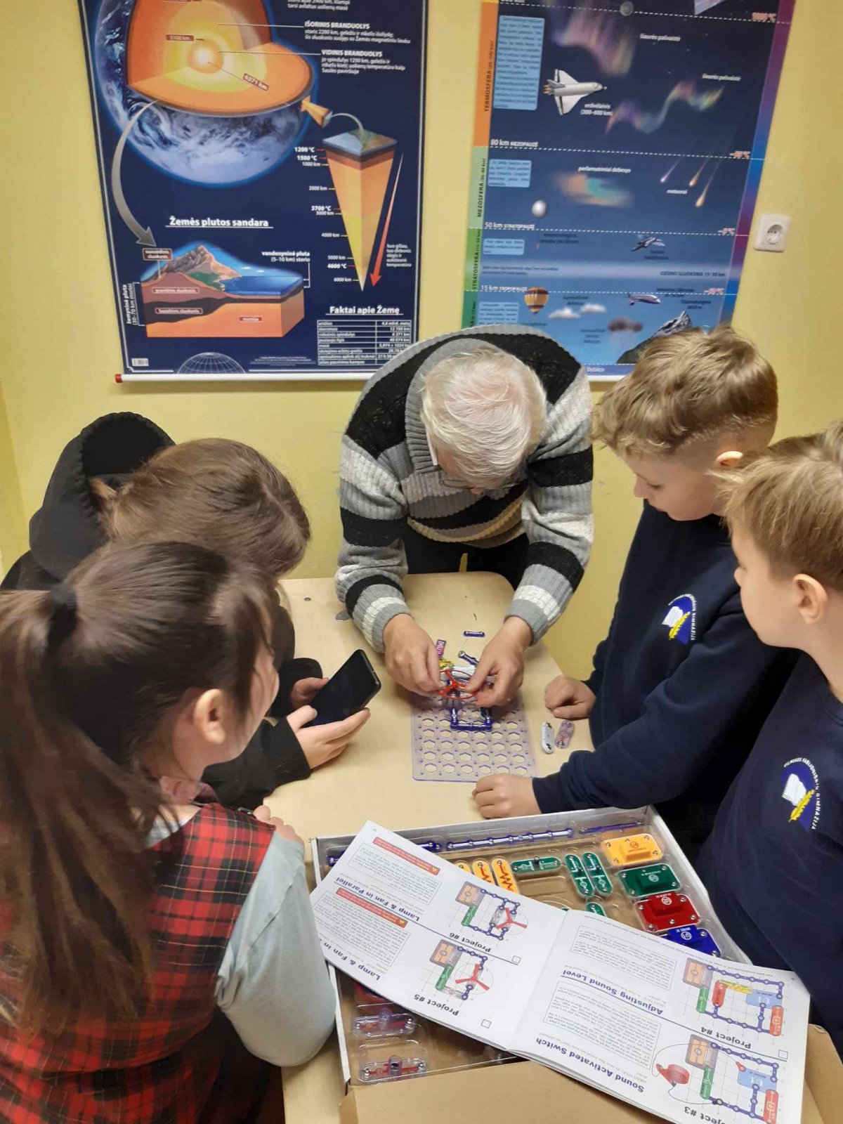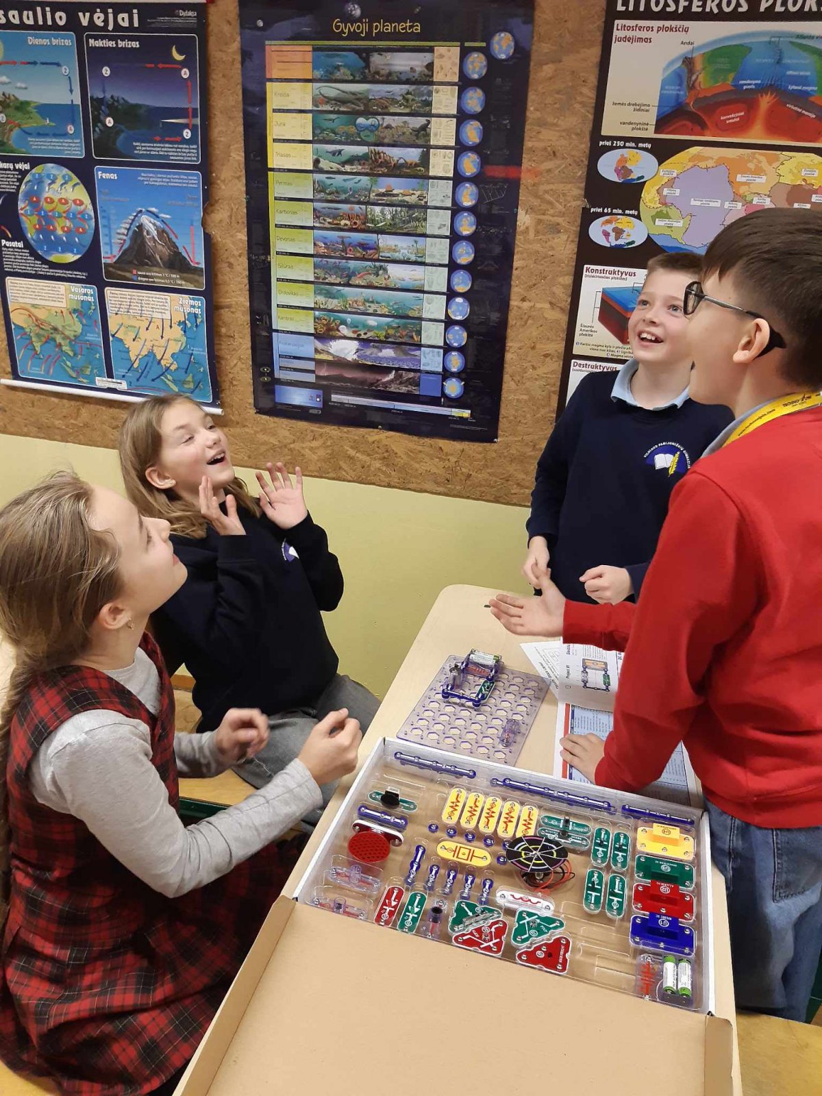 Fizikos pamokoje mokiniai, naudodamiesi priemonių rinkiniu, sujungė elektros grandinę. Ypatingai pradžiugino rezultatas - šviečianti lemputė, melodiją grojantis garsiakalbis ir skrendantis sukutis.