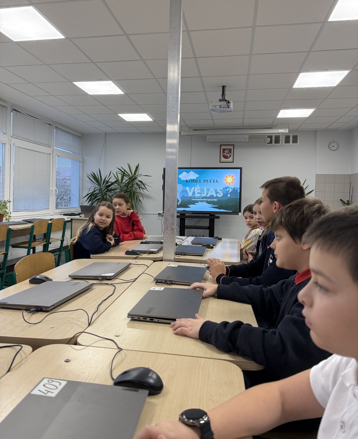 Geografijos pamokoje ketvirtokai susipažino su vėjo ir brizo sąvokomis. Dauguma mokinių galvojo, kad žino, kas yra vėjas, bet apibūdinti jį buvo sudėtinga. Mokytoja išsamiai paaiškino, kaip jis pučia ir atliko keletą bandymų, kurie vizualiai parodė, kas nutinka esant skirtingai temperatūrai. Mokiniai sužinojo, kas rodo vėjo kryptį, ir gamino vėjarodį. Pamoka buvo įdomi bei informatyvi.
