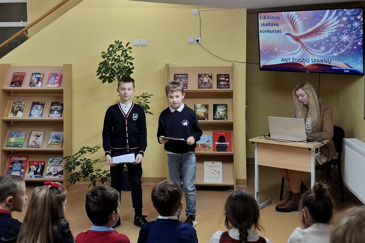Tarp 3–4 klasių mokinių nugalėtoju tapo 4b klasės mokinys Nojus Starkus (mokytoja D. Jazavitienė). Jis deklamavo J. Nekrošiaus eilėraštį „Kuklus noras“ ir išsiskyrė ypatingu įtaigumu bei puikia dikcija.