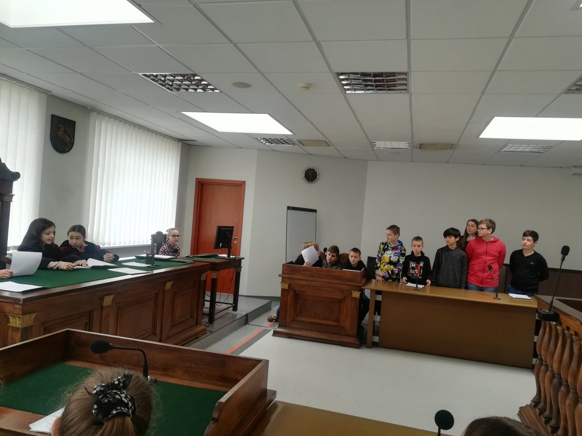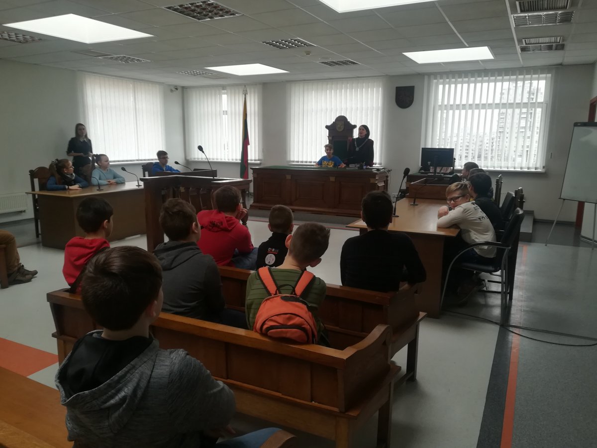 5B klasė apsilankė Vilniaus apylinkės teisme. Juos pasitiko teismo pirmininkas M. Kursevičius ir aprodė teismo patalpas, net ir tas, kur laikomi sulaikytieji, papasakojo apie teismų darbą. Paskui vaikai buvo palydėti į vieną iš gražiausių salių, kur visi dalyvavo inscenizuotame teismo procese pagal visas taisykles.