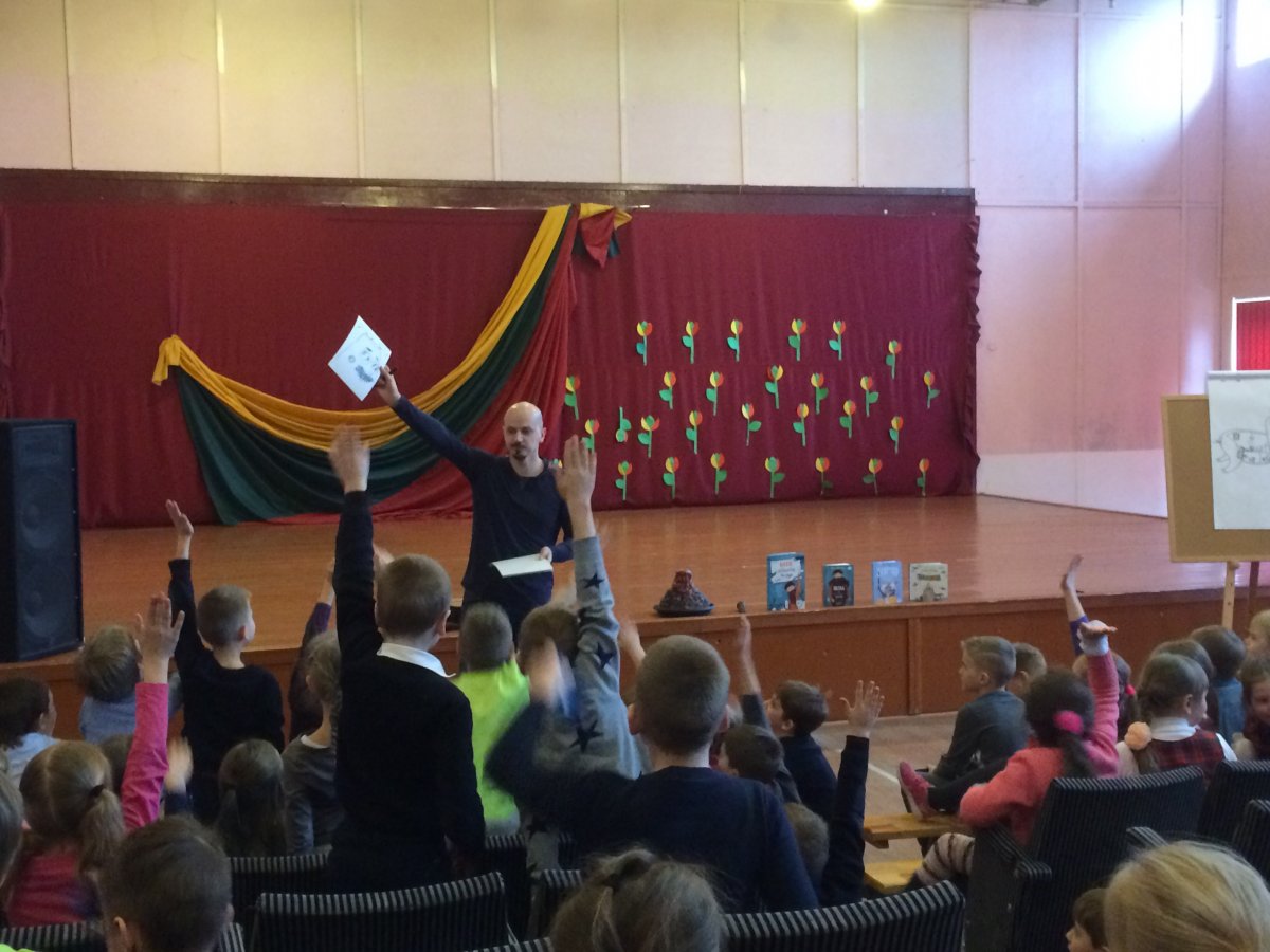1-ų klasių mokiniai susitiko su rašytoju Virgiu Šidliausku, kuris savo sukurtomis linksmomis dainelėmis pristatė knygų veikėjus: povandeninį laivą – paršelį, ugnikalnių šeimynėlę, berniuką Ulfą, kuriam užaugo barzda … Vaikai stebėjo, kaip autorius piešė knygų personažus, pritarė dainoms. Pirmokai suprato, kad norint tapti rašytoju reikia daug skaityti ir nebijoti kurti savo pasaulį.