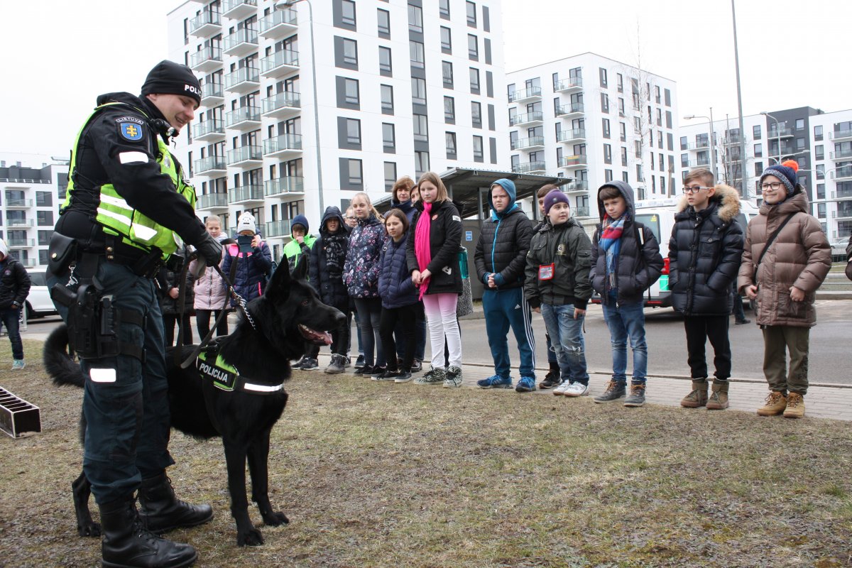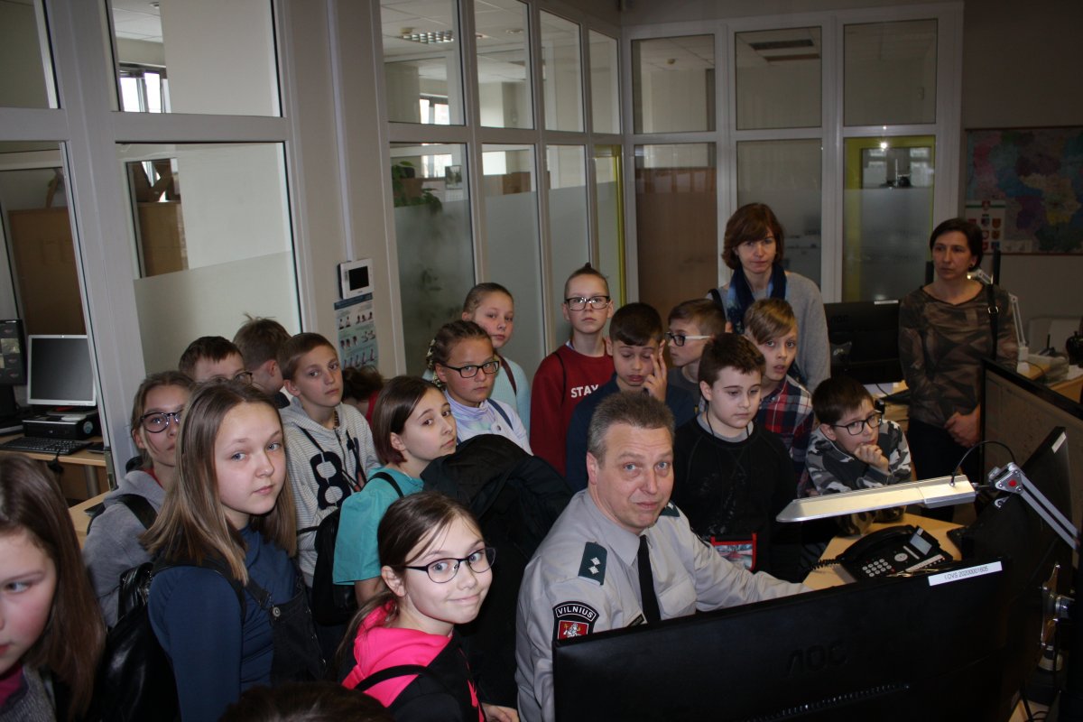5C klasės mokiniai apsilankė pas Justės mamą Vilniaus apskrities vyriausiajame policijos komisariate. Ten mokiniams buvo organizuota pamoka apie policijos istoriją, pademonstruota, kaip keitėsi uniformos nuo carinės Lietuvos iki dabartinių laikų. Mokiniai turėjo galimybę susipažinti su Vilniaus policijoje tarnaujančiu kinologu ir jo pėdsekiu keturkoju draugu. Taip pat mokiniai pamatė, kaip veikia Vilniaus mieste stebėjimo kameros. Įsitikino patys, kiek daug Vilniuje yra stebima parkų ir gatvių, kad užtikrintų mūsų visų saugumą. Mokiniai įsitikino, kokia yra sunki ir pavojinga, atsakinga, bet labai reikalinga policininko profesija.
